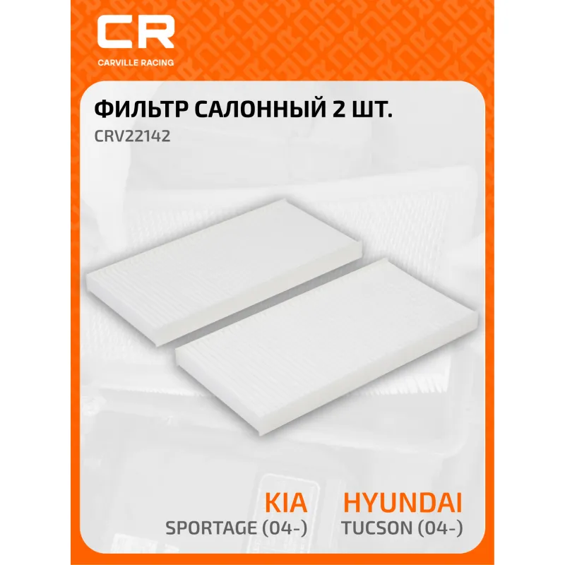Фильтр салонный для автомобилей Hyundai Tucson (04-)/Kia Sportage (04-)/Sorento (02-) Описание: Салонные фильтры обеспечивают подачу очищенного воздуха в салон автомобиля, эффективно защищают водителя и пассажиров от воздействия пыли, сажи, смога, пыльцы и других дорожных загрязнений. Большое количество складок и большая площадь фильтрации обеспечивают фильтрацию мельчайших загрязнений и большую грязеемкость для длительного срока службы. Устойчивы к воздействию влаги и перепаду температур, предотвращают запотевание окон. Применяемость HYUNDAI TUCSON, KIA SORENTO, SPORTAGE, TOYOTA HILUX. Чтобы убедиться, что деталь подойдет на Ваш автомобиль, пожалуйста, отправьте через кнопку 'Задать вопрос' нам сообщение с VIN-номером вашего автомобиля. Точные посадочные габариты исключают прохождение воздуха в обход фильтра. Угольные фильтры обеспечивают лучшую фильтрацию выхлопных газов и неприятных запахов. Антибактериальные фильтры с дополнительной защитой от бактерий, аллергенов и вирусов. Вся продукция подвергается испытаниям в специализированных лабораториях, аккредитованных стандартами с ISO 17025: 2017 и CNAS-CL01. В нашем магазине, вы найдете широкий ассортимент высококачественных автотоваров, автозапчастей, ремонтные комплекты авто аксессуары, электрооборудование, автогаджеты и девайсы, фильтры и многое другое. Мы гарантируем качество и надежность наших товаров. Характеристики: Артикул: CRV22142 OEM номера: 97133-2E910, 97133-2E900 Ширина, мм: 107 Длина, мм: 216 Высота, мм: 17 Количество в комплекте, шт: 2 Исполнение фильтра: Частичный фильтр Комплект: Да Количество на автомобиль: 1 Комплектация: Фильтр салонный - 2 шт Гарантия: от 1 года.