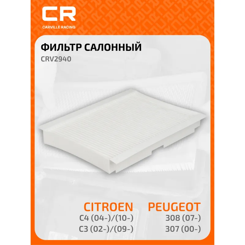 Фильтр салонный для автомобилей Peugeot 308 (07-)/307 (00-)/Citroen C4 (04-)/(10-)/C3 (02-)/(09-) Описание: Салонные фильтры CRV2940 бренда CARVILLE RACING обеспечивают подачу очищенного воздуха в салон автомобиля, эффективно защищают водителя и пассажиров от воздействия пыли, сажи, смога, пыльцы и других дорожных загрязнений. Большое количество складок и большая площадь фильтрации обеспечивают фильтрацию мельчайших загрязнений и большую грязеемкость для длительного срока службы. Подбор по VIN-номеру вашего автомобиля - через кнопку 'Задать вопрос'. Специалист проверит применяемость и ответит вам. Применяемость CITROEN DS4, C4 PICASSO, C4, C3, C3 PICASSO, C2, BERLINGO, XSARA PICASSO, DS DS4 CROSSBACK, PEUGEOT RCZ, 408, 308, 307, 1007, PARTNER.. Устойчивы к воздействию влаги и перепаду температур, предотвращают запотевание окон. Точные посадочные габариты исключают прохождение воздуха в обход фильтра. Вся продукция подвергается испытаниям в специализированных лабораториях, аккредитованных стандартами с ISO 17025: 2017 и CNAS-CL01. Изготавливается по современным технологиям. Применение фильтра улучшает воздухопоток в салоне. Фильтр обеспечивает чистоту воздуха в салоне автомобиля. Характеристики: Артикул: CRV2940 OEM номера: 6447 NT, 6447 TL, 9687459780, E146155, 6447 KK, 6479 C2 Ширина, мм: 176 Длина, мм: 284 Высота, мм: 36 Исполнение фильтра: Частичный Количество на автомобиль: 1 Комплектация: Фильтр салонный - 1 шт Гарантия: от 1 года.