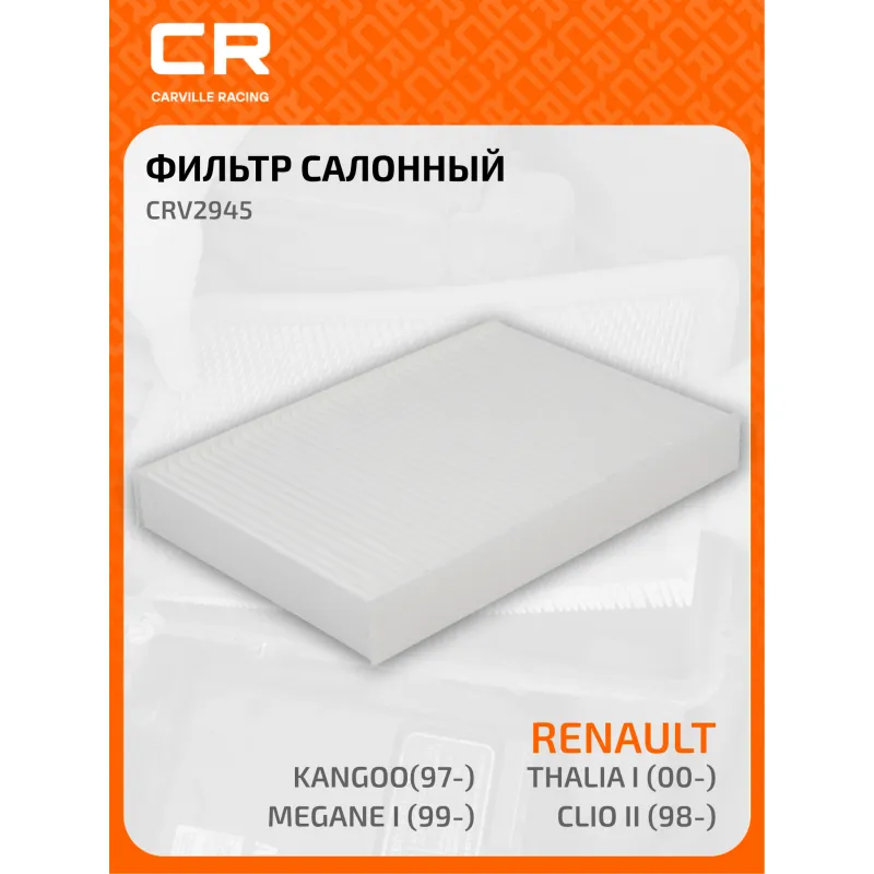 Фильтр салонный для автомобилей Renault Thalia I (00-)/Clio II (98-)/Kangoo(97-)/Megane I (99-) Описание: Салонные фильтры обеспечивают подачу очищенного воздуха в салон автомобиля, эффективно защищают водителя и пассажиров от воздействия пыли, сажи, смога, пыльцы и других дорожных загрязнений. Большое количество складок и большая площадь фильтрации обеспечивают фильтрацию мельчайших загрязнений и большую грязеемкость для длительного срока службы. Устойчивы к воздействию влаги и перепаду температур, предотвращают запотевание окон. Применяемость NISSAN KUBISTAR, RENAULT KANGOO, MEGANE, CLIO, CLIO SYMBOL / THALIA. Чтобы убедиться, что деталь подойдет на Ваш автомобиль, пожалуйста, отправьте через кнопку 'Задать вопрос' нам сообщение с VIN-номером вашего автомобиля. Точные посадочные габариты исключают прохождение воздуха в обход фильтра. Угольные фильтры обеспечивают лучшую фильтрацию выхлопных газов и неприятных запахов. Антибактериальные фильтры с дополнительной защитой от бактерий, аллергенов и вирусов. Вся продукция подвергается испытаниям в специализированных лабораториях, аккредитованных стандартами с ISO 17025: 2017 и CNAS-CL01. В нашем магазине, вы найдете широкий ассортимент высококачественных автотоваров, автозапчастей, ремонтные комплекты авто аксессуары, электрооборудование, автогаджеты и девайсы, фильтры и многое другое. Мы гарантируем качество и надежность наших товаров. Характеристики: Артикул: CRV2945 OEM номера: 27891-00Q0A, B729800QAA, 77 00 424 098 Ширина, мм: 158 Длина, мм: 230 Высота, мм: 30 Исполнение фильтра: Частичный фильтр Количество на автомобиль: 1 Комплектация: Фильтр салонный - 1 шт Гарантия: от 1 года.