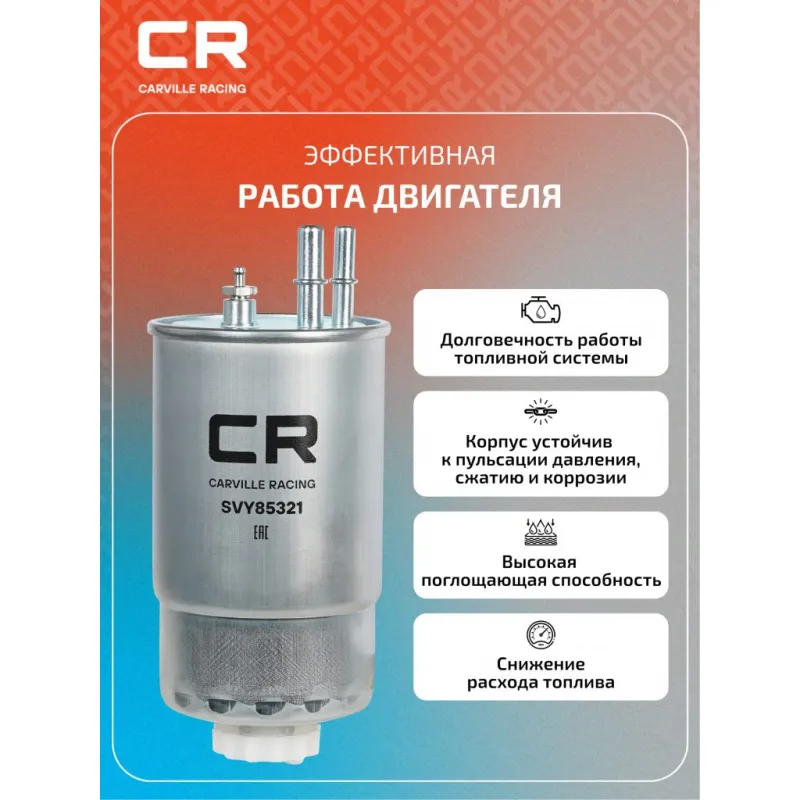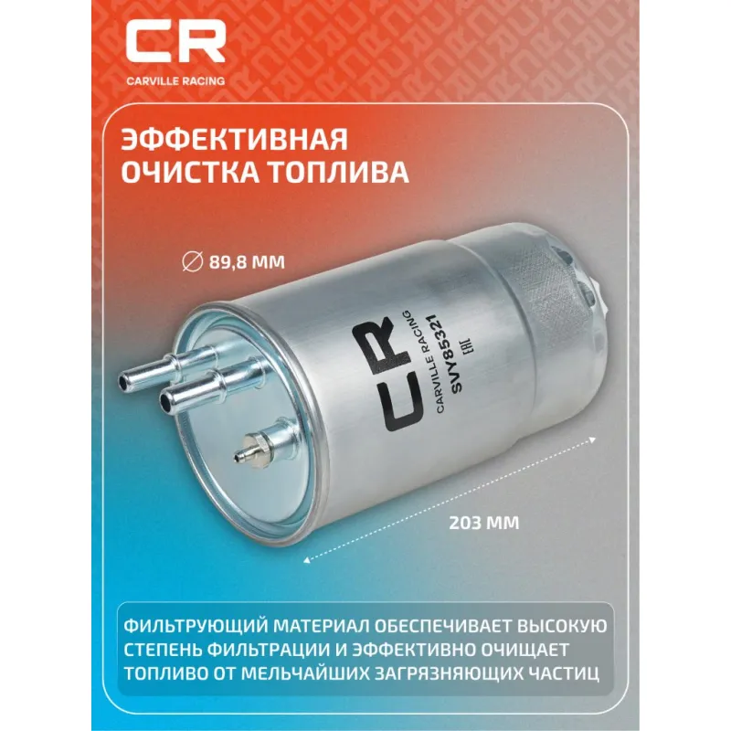 Фильтр топливный для автомобилей Fiat Ducato (06-) 2.3D (-06.12) до кузова №2244465 Описание: Топливные фильтры CARVILLE RACING эффективно очищают топливо от мельчайших загрязняющих частиц и воды, сохраняя работоспособность топливной аппаратуры автомобиля. Высокоэффективные фильтровальные материалы обеспечивают эффективное отделение самых мелких загрязнений и обладают высокой емкостью поглощения загрязнений. - Применяемость фильтра для автомобилей: ALFA ROMEO SPIDER, MITO, GIULIETTA, BRERA, 159, CHRYSLER DELTA, YPSILON, CITROEN NEMO, JUMPER, FIAT STRADA, STILO, QUBO, PUNTO, PANDA, LINEA, IDEA, FIORINO, DUCATO, DOBLO, CROMA, BRAVO, 500, BRAVO Van, FORD KA, LANCIA YPSILON, MUSA, DELTA, OPEL COMBO, PEUGEOT BOXER, BIPPER, VAUXHALL COMBO.. Подбор по VIN-номеру вашего автомобиля - через кнопку 'Задать вопрос'. Специалист проверит применяемость и ответит вам. Благодаря минимальному сопротивлению обеспечивают наилучшую прокачиваемость топлива через фильтр. Благодаря снижению пульсации топлива в системе обеспечивается равномерная подача топлива. Прочный корпус обеспечивает полную герметичность, устойчив к пульсации давления и сжатию. Производство фильтров осуществляется на высокотехнологичных автоматизированных линиях, сертифицированных стандартом IATF 16949:2016. Вся продукция испытывается в испытательных лабораториях, аккредитованных стандартами по ISO 17025: 2017 и CNAS-CL01. Показатели эффективности превосходят промышленные стандарты качества. Фильтрующий элемент способен справиться с задачей грубой и тонкой очистки. Незаменимый компонент в автомобиле, обеспечивающий эффективную очистку топлива от загрязнений и поддержания топливной системы работоспособной надолго. Характеристики: Артикул: SVY85321 OEM номера: 1901 A3, 6001073285, 77363657, 1729 042, BS51-9155-A, 818020, 1606384980, 95513399, 95514995 Высота, мм: 203 Наружный диаметр, мм: 89.8 Диаметр впуск, мм: 9.49 Диаметр выпуск, мм: 7.89 Исполнение фильтра: Прямоточный фильтр Количество на автомобиль: 1 Комплектация: Фильтр топливный - 1 шт Гарантия: от 1 года.