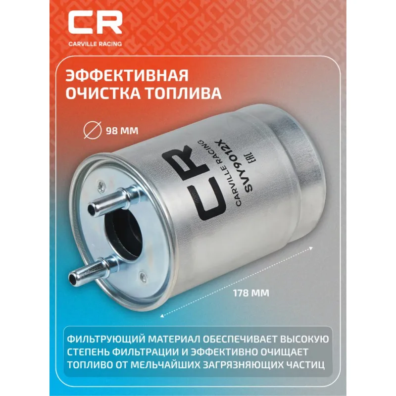 Фильтр топливный для автомобилей Renault Scenic III (09-) / Megane III Grandtour (09-) 1.5D Описание: Применяемость RENAULT MEGANE, SCENIC, FLUENCE, SUZUKI GRAND VITARA. Чтобы убедиться, что деталь подойдет на Ваш автомобиль, пожалуйста, отправьте через кнопку 'Задать вопрос' нам сообщение с VIN-номером вашего автомобиля. Топливные фильтры CARVILLE RACING эффективно очищают топливо от мельчайших загрязняющих частиц и воды, сохраняя работоспособность топливной аппаратуры автомобиля. Высокоэффективные фильтровальные материалы обеспечивают эффективное отделение самых мелких загрязнений и обладают высокой емкостью поглощения загрязнений. Благодаря минимальному сопротивлению обеспечивают наилучшую прокачиваемость топлива через фильтр. Благодаря снижению пульсации топлива в системе обеспечивается равномерная подача топлива. Прочный корпус обеспечивает полную герметичность, устойчив к пульсации давления и сжатию. Вся продукция CARVILLE RACING подвергается испытаниям в специализированных лабораториях, аккредитованных стандартами с ISO 17025: 2017 и CNAS-CL01. Основные показатели эффективности превосходят промышленные стандарты качества. Характеристики: Артикул: SVY9012X OEM номера: 16 40 093 84R, 77 01 070 647, 77 01 478 821, 77 01 479 305, 82 01 015 125, 82 01 046 788, 15411-80KA0, 15411-80KA0-000 Высота, мм: 178 Наружный диаметр, мм: 98 Диаметр впуск, мм: 9.89 Диаметр выпуск, мм: 9.89 Размер резьбы на выходе: M12x1,75-6H Исполнение фильтра: Прямоточный фильтр Количество на автомобиль: 1 Комплектация: Фильтр топливный - 1 шт Гарантия: от 1 года.