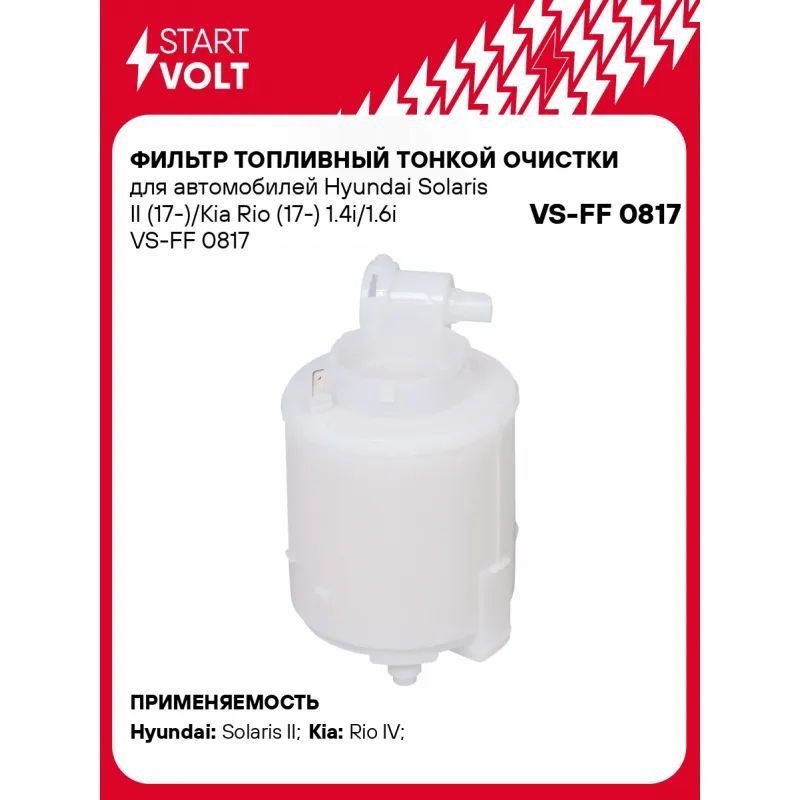 Фильтр топливный тонкой очистки для автомобилей Hyundai Solaris II (17-)/Kia Rio (17-) 1.4i/1.6i Описание: Топливный фильтр тонкой очистки для автомобилей HYUNDAI SOLARIS, CRETA, KIA RIO, SELTOS.. Предназначен для очистки топлива от посторонних примесей. Фильтр представляет собой прочный корпус с входным и выходным штуцерами, через которые топливо соответственно поступает в топливный фильтр и выходит из него уже очищенным. В корпусе находится сам фильтрующий элемент, состоящий из бумаги, который непосредственно и очищает топливо. Служит для финальной очистки топлива. Он может устанавливаться как в сам топливный насос/модуль, так и в топливную магистраль. Если у вас есть вопросы по применяемости, мы всегда готовы помочь вам с подбором по VIN-НОМЕРУ ВАШЕГО АВТОМОБИЛЯ. Характеристики: Артикул: VS-FF 0817 OEM номера: 31112-F9000, 31112-A2200 Количество на автомобиль: 1 Материал корпуса: Пластик Подходит для авто: Hyundai Solaris II (17-) Kia Rio IV (17-), Rio IV (17-) Для проверки применяемости отправьте VIN автомобиля через вкладку "Есть вопросы о товаре?" Комплектация: Паспорт изделия/гарантийный талон - 1 шт Фильтр топливный тонкой очистки - 1 шт Гарантия: от 1 года.