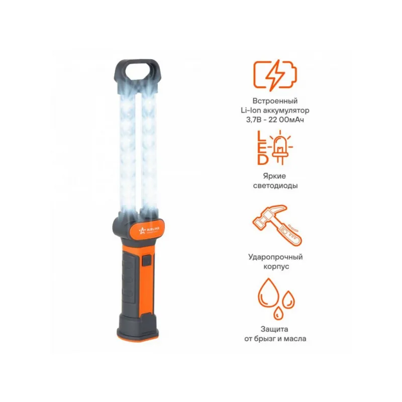 Фонарь аккум. переноска светодиодный LED Описание: Фонарь аккумуляторный переносной AFL-35W-05 от бренда AIRLINE, ударопрочный энергоэффективный источник света, используется в качестве яркого источника света в области строительных и ремонтных работ, а также при разрешении различного рода аварийных ситуаций. Фонарь работает на основе COB светодиодов, которые встроены в корпус изделия. Фонарь представляет собой переносное устройство со встроенным аккумулятором. Зарядка производится от USB. Используется: в автомобиле, в автобусе, в грузовике, на рыбалке, на охоте, в походе. Технические особенности и преимущества: Крепление - крюк "свободные руки"; Питание - встроенный LI-Ion аккумулятор (3.7В 2200мАч); Кол-во светодиодов - 24, Мощный Chip on board COB светодиод; Время полной зарядки - 5-7 ч; Время работы - 3-4 ч; Адаптер 220В - зарядка от сети; Адаптер 12В - зарядка от прикуривателя; Превосходный аксессуар для каждого транспортного средства; Защита от брызг и масла; Мощный фонарик светильник идеальное решение для активного отдыха и повседневного использования, для огорода и дачи, для охоты и для рыбалки. Ручной спортивный туристический рабочий кемпинговый автомобильный фонарь идеален для того, чтобы брать его с собой и хранить в автомобиле. Поможет в условиях плохой видимости во время ремонта на дороге или в гараже. Наш спортивный инвентарь подойдет для спорта, для туризма и похода, охоты и рыбалки. Нужный подарок автомобилисту, мужчине и женщине, автолюбителю, папе, отцу, брату, любимому, мужу, парню и другу, на день рождения, Новый год, 23 февраля. Товар официального производителя AIRLINE. Характеристики: Артикул: AFL-35W-05 Питание: встроенный LI-Ion аккумулятор (3.7В 2200мАч) Тип источника света: Светодиод Время полной зарядки, ч: 5 Комплектация: Фонарь - 1 шт Кабель USB - 1 шт Гарантия: от 1 года.