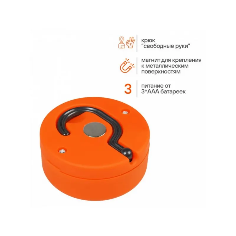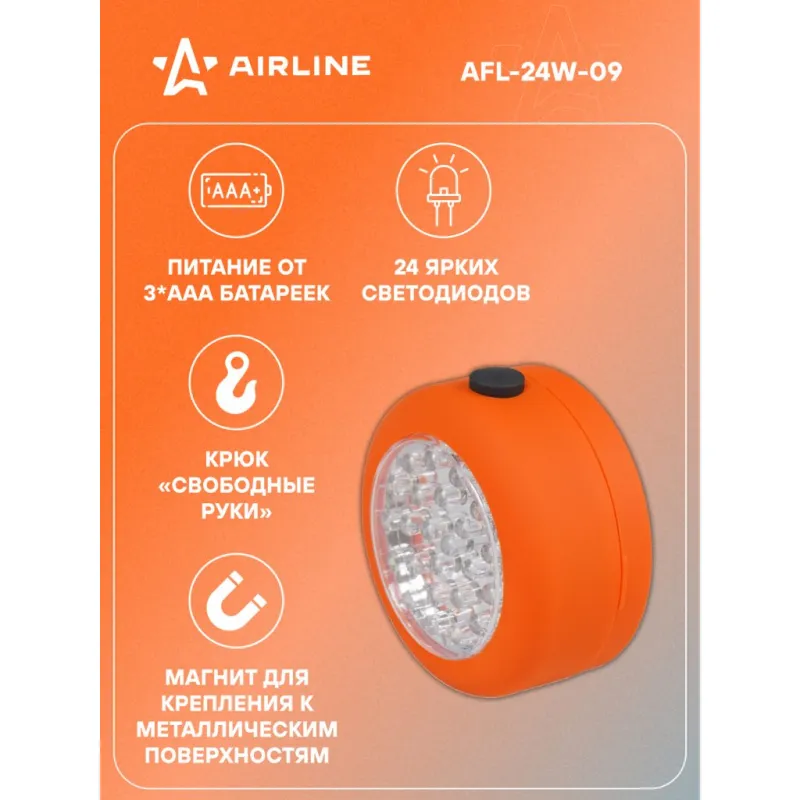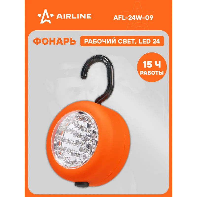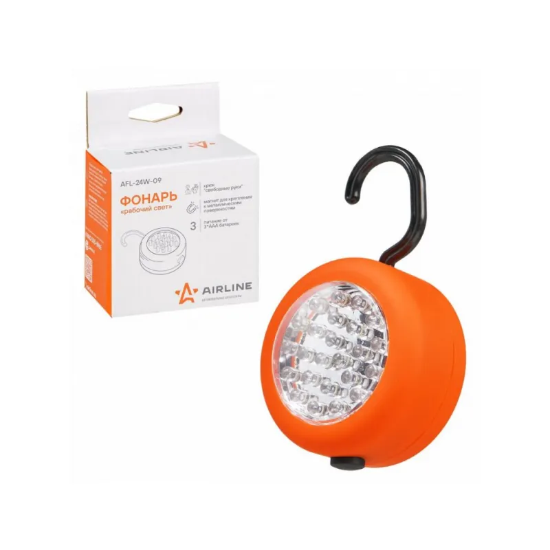 Фонарь рабочий свет с крюком и магнитом LEDx24 Описание: Фонарь подвесной светодиодный на батарейках AFL-24W-09 от бренда AIRLINE - "рабочий свет", предназначен для использования в бытовых и профессиональных целях. Корпус изделия изготовлен из прочного пластика и дополнен креплением в виде магнита и крюка. Функционирование изделия осуществляется путем подключения батареек в количестве трех штук категории ААА. Максимальное время непрерывной работы фонаря составляет 15 часов. Используется: в автомобиле, в автобусе, в грузовике, на рыбалке, на охоте, в походе. Технические особенности и преимущества: Крепление - крюк "Свободные руки" и магнит для крепления к металлическим поверхностям; Питание - 3 батарейки ААА (4.5В); Кол-во светодиодов - 24, LED светодиоды; Время работы - 15 ч; Превосходный аксессуар для каждого транспортного средства, дома, гаража; Мощный фонарик светильник идеальное решение для активного отдыха и повседневного использования, для огорода и дачи, для охоты и для рыбалки. Ручной спортивный туристический рабочий кемпинговый автомобильный фонарь идеален для того, чтобы брать его с собой и хранить в автомобиле. Поможет в условиях плохой видимости во время ремонта на дороге или в гараже. Наш спортивный инвентарь подойдет для спорта, для туризма и похода, охоты и рыбалки. Нужный подарок автомобилисту, мужчине и женщине, автолюбителю, папе, отцу, брату, любимому, мужу, парню и другу, на день рождения, Новый год, 23 февраля. Товар официального производителя AIRLINE. Характеристики: Артикул: AFL-24W-09 Питание: 3 батарейки ААА (4.5В) Кол-во светодиодов: 24 Тип источника света: Светодиод Время работы, ч: 15 Комплектация: Фонарь - 1 шт Гарантия: от 1 года.