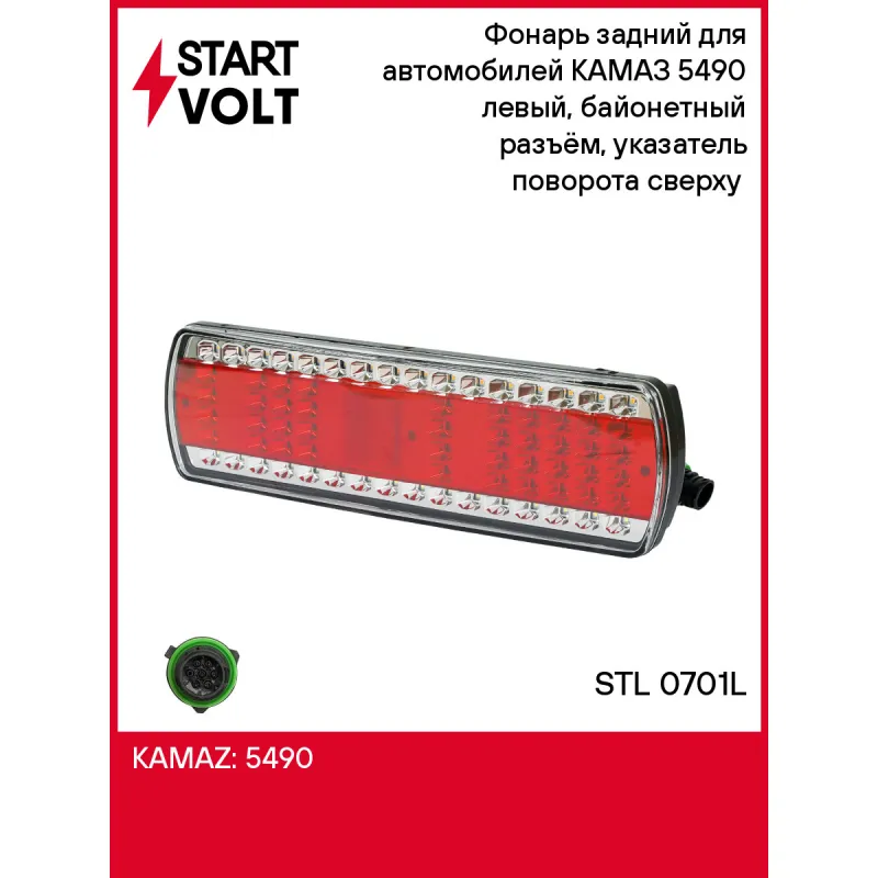 Фонарь задний для автомобилей КАМАЗ 5490 левый, байонетный разъём, указатель поворота сверху (светодиодный) Характеристики: Артикул: STL 0701L OEM номера: 112.08.69-03 Напряжение: 24В Сторона установки: Слева Тип осветительного прибора: LED Тип лампы/ламп: LED Количество на автомобиль: 1 Сторона движения: правостороннее Комплектация: Фонарь задний в сборе - 1 шт Паспорт изделия - 1 шт Гарантия: от 1 года.