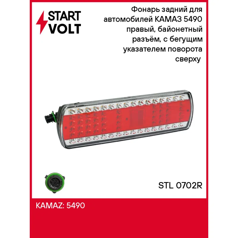 Фонарь задний для автомобилей КАМАЗ 5490 правый, байонетный разъём, с бегущим указателем поворота сверху (светодиодный) Характеристики: Артикул: STL 0702R OEM номера: 112.08.69-02-TRS Напряжение: 24В Сторона установки: Справа Тип осветительного прибора: LED Тип лампы/ламп: LED Количество на автомобиль: 1 Сторона движения: правостороннее Комплектация: Фонарь задний в сборе - 1 шт Паспорт изделия - 1 шт Гарантия: от 1 года.