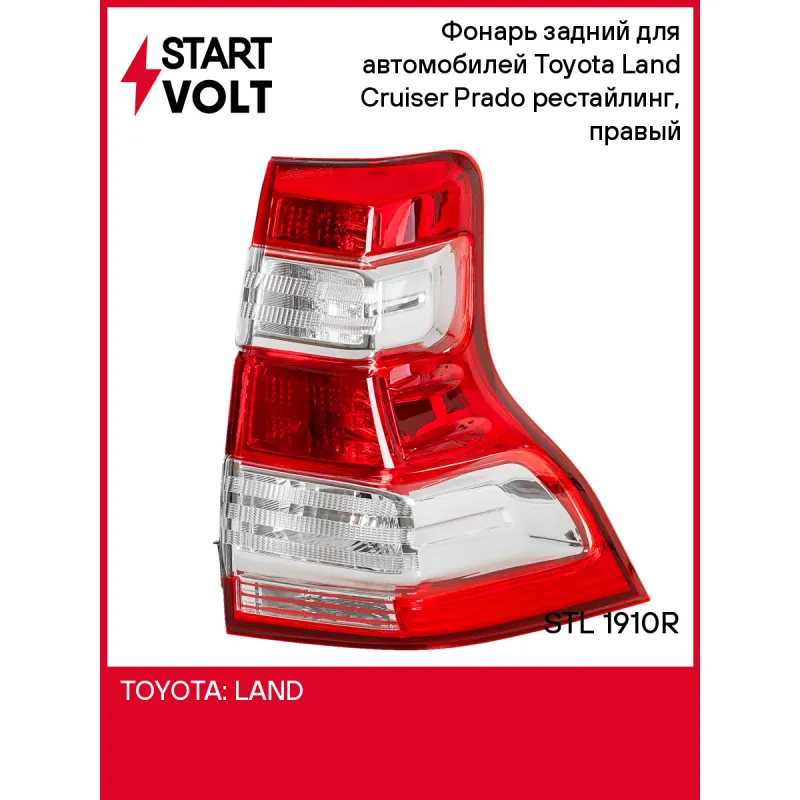 Фонарь задний для автомобилей Toyota Land Cruiser Prado (09-) рестайлинг, правый Характеристики: Артикул: STL 1910R OEM номера: 81551-60B51, 81551-60B50 Напряжение: 12В Сторона установки: справа Тип осветительного прибора: Галоген Тип лампы/ламп: W16W/WY21W/LED Оснащение (корректор): Электрический Количество на автомобиль: 1 Сторона движения: правостороннее Комплектация: Фонарь задний в сборе - 1 шт Паспорт изделия - 1 шт Гарантия: от 1 года.