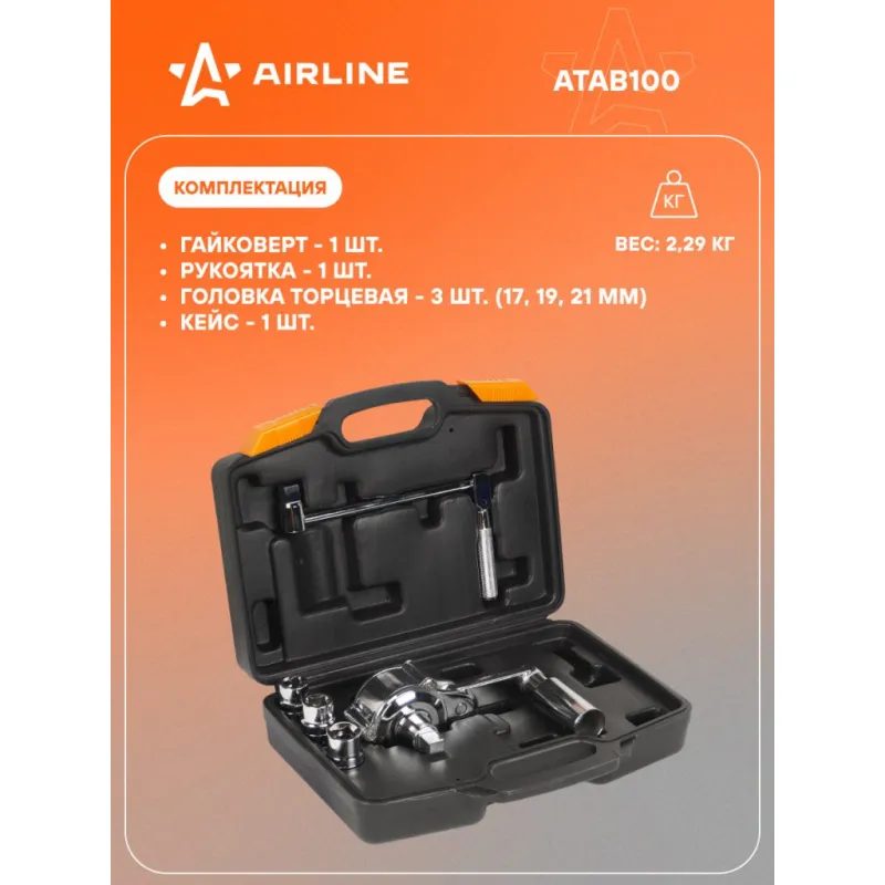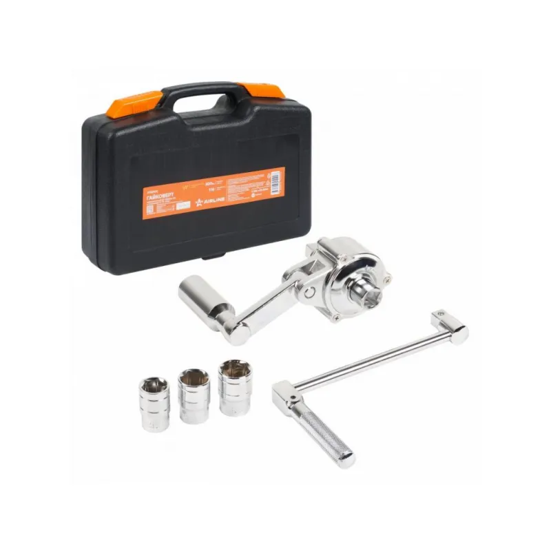 Гайковерт механич. 1/2" 800Нм 1:16 с головками 17, 19, 21мм пласт. кейс Описание: Механический гайковерт 800 Нм 1/2"DR Airline ATAB100, в пластиковом кейсе представляет собой многоступенчатый редуктор, который многократно увеличивает крутящий момент прилагаемый к рукоятке. Таким образом, без больших усилий оператора можно отвинтить гайки крепления колёс на грузовиках и специальной технике. Инструмент выполнен из прочных и качественных материалов, обладающих надежностью и долговечностью. Гайковерт поставляется в удобном пластиковом кейсе для рационального хранения и транспортировки. Преимущества Airline ATAB100: *Кейс для хранения и переноски. *Инструмент устойчив к механическому износу. *Рукоятка, головки торцевые 3 шт, кейс в комплекте. Гайковерт механический - это отличный вариант подарка любимому мужу, мужчине другу, папе, отчиму или коллеге! Характеристики: Артикул: ATAB100 Размер присоединительного квадрата: 1/2" Длина удлинителя, мм: - Твердость шестерней, HRC: 44-48 Длина гайковерта, мм: 165 Максимальный момент силы, Нм: 800 Передаточное число: 1:16 Комплектация: Рукоятка - 1 шт Гайковёрт - 1 шт Головка торцевая - 3 шт Кейс - 1 шт Гарантия: от 1 года.