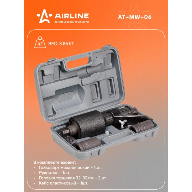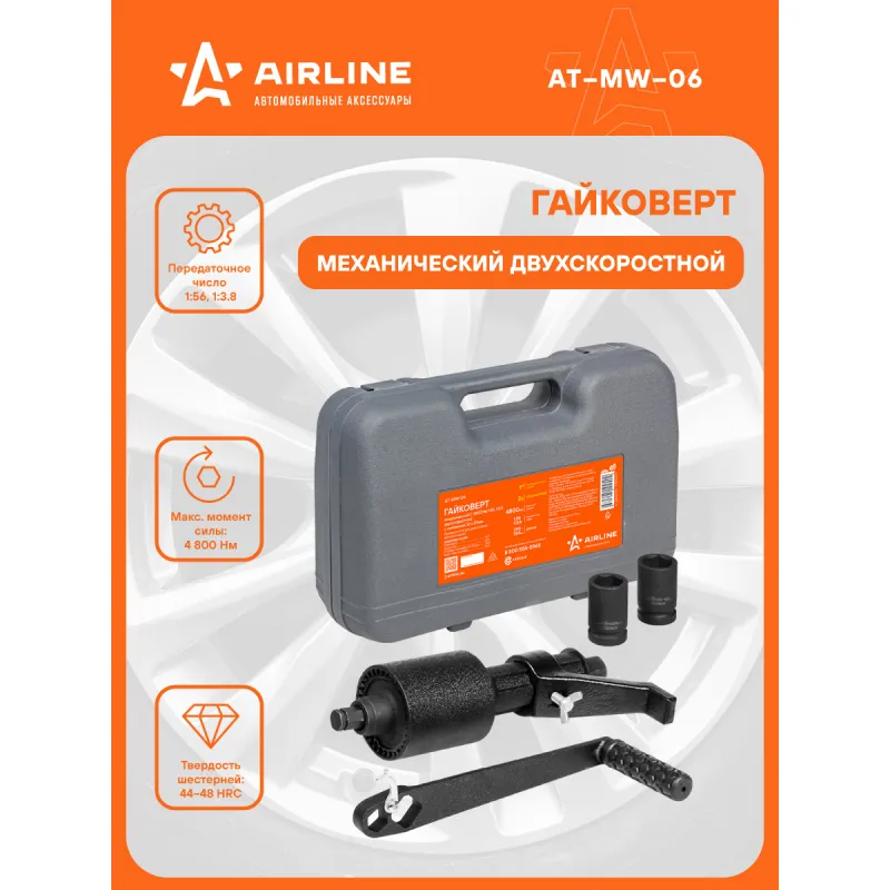 Гайковерт механич. 1" 4800Нм 1:56, 1:3.8 двухскорост. 290-360мм с головками 32 и 33мм пласт. кейс Описание: Механический гайковерт двухскоростной 4800 Нм 1" Airline AT-MW-06, в пластиковом кейсе - незаменимый инструмент как для домашнего, так и для профессионального использования, представляет собой многоступенчатый редуктор, который многократно увеличивает крутящий момент прилагаемый к рукоятке. Таким образом, без больших усилий оператора можно отвинтить гайки крепления колёс на грузовиках и специальной технике. Инструмент выполнен из прочных и качественных материалов, обладающих надежностью и долговечностью. Гайковерт поставляется в удобном пластиковом кейсе для рационального хранения и транспортировки. Преимущества Airline AT-MW-06: *Кейс для хранения и переноски. *Инструмент устойчив к механическому износу. *Низкая пожаро- и взрывоопасность рабочего процесса благодаря работе на сжатом воздухе. Мощный и надежный, он пригодится для работы в мастерских и автосервисах, а также для бытового ремонта в домашнем гараже. Гайковерт механический - это отличный вариант подарка любимому мужу, мужчине другу, папе, отчиму или коллеге! Характеристики: Артикул: AT-MW-06 OEM номера: 40301 Максимальный момент силы, Нм: 4800 Длина гайковерта, мм: 290-360 Длина удлинителя, мм: - Твердость шестерней, HRC: 44-48 Передаточное число: 1:56, 1:3.8 Размер присоединительного квадрата: 1" Комплектация: Гайковёрт - 1 шт Рукоятка - 1 шт Головка торцевая 32, 33мм - 2 шт Кейс пластиковый - 1 шт Гарантия: от 1 года.