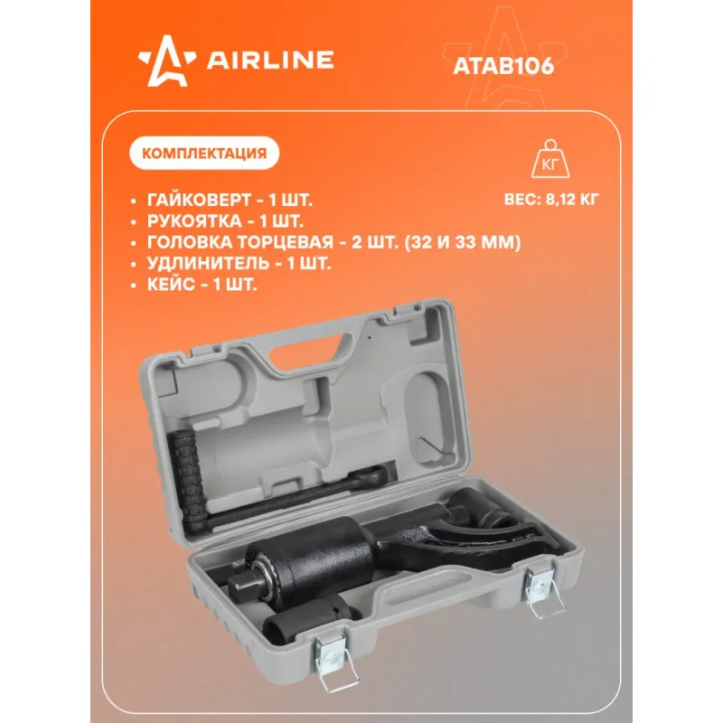 Гайковерт механич. 1" 4800Нм 1:64 360мм с головками 32 и 33мм пласт. кейс Описание: Механический гайковерт 4800 Нм 1"DR Airline ATAB106, в пластиковом кейсе представляет собой многоступенчатый редуктор, который многократно увеличивает крутящий момент прилагаемый к рукоятке. Таким образом, без больших усилий оператора можно отвинтить гайки крепления колёс на грузовиках и специальной технике. Инструмент выполнен из прочных и качественных материалов, обладающих надежностью и долговечностью. Гайковерт поставляется в удобном пластиковом кейсе для рационального хранения и транспортировки. Преимущества Airline ATAB106: *Кейс для хранения и переноски. *Инструмент устойчив к механическому износу. Рукоятка, головка торцевая 2 шт, удлинитель, кейс в комплекте. Гайковерт механический - это отличный вариант подарка любимому мужу, мужчине другу, папе, отчиму или коллеге! Характеристики: Артикул: ATAB106 Размер присоединительного квадрата: 1" Длина удлинителя, мм: 350 Твердость шестерней, HRC: 44-48 Длина гайковерта, мм: 360 Максимальный момент силы, Нм: 4800 Передаточное число: 1:64 Комплектация: Гайковёрт - 1 шт Удлинитель - 1 шт Рукоятка - 1 шт Головка торцевая - 2 шт Кейс - 1 шт Гарантия: от 1 года.