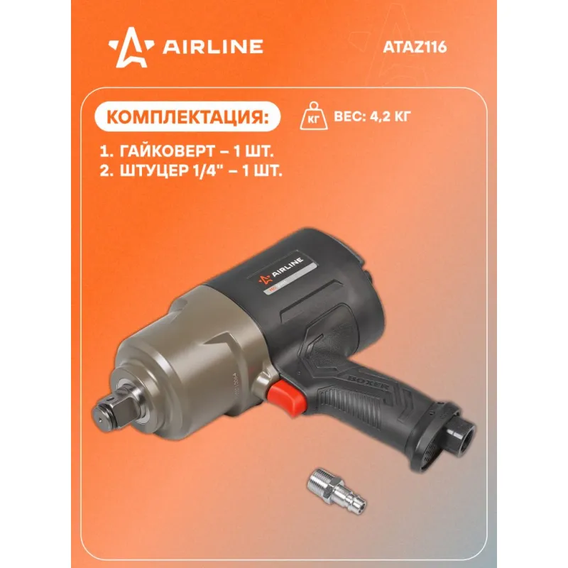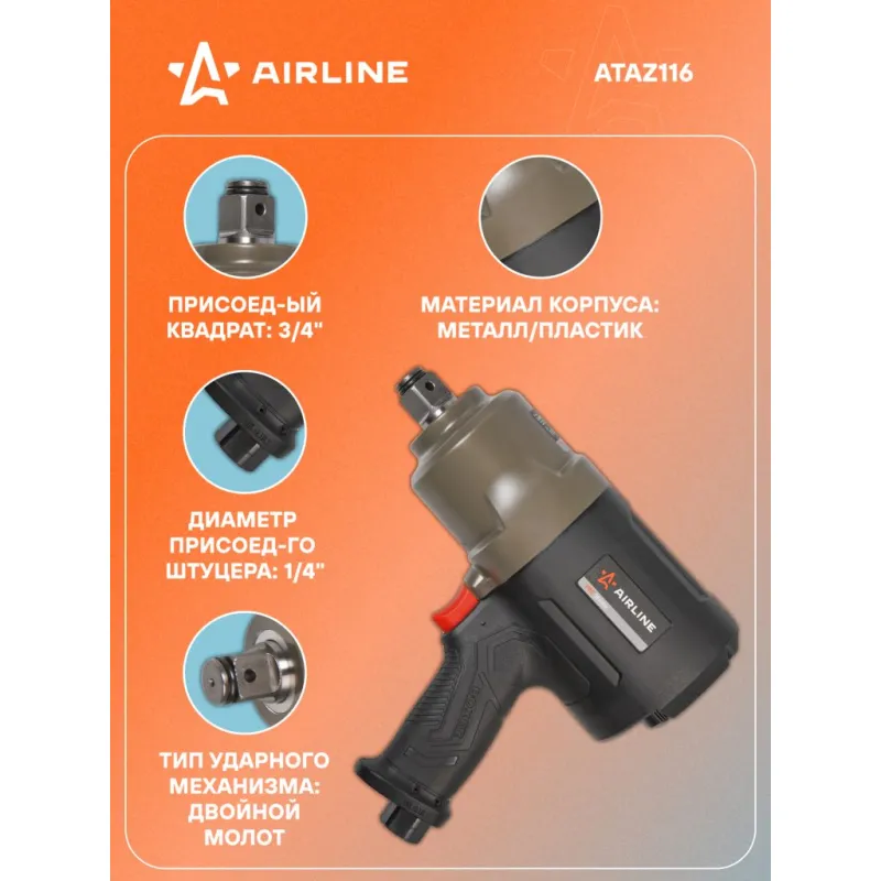 Гайковерт пневматический ударный композитный 3/4"DR 2100Нм PRO Описание: Пневматический ударный гайковерт применяется для механизации слесарно-монтажных работ для затяжки (закручивания) или ослабления (откручивания) особонагруженных и осложненных резьбовых соединений с высокой скоростью, мощностью, дифференцированным крутящим моментом и низкими затратами энергии и физических сил оператора. Характеристики: Артикул: ATAZ116 Вес, кг: 4.1 Присоединительный квадрат: 3/4" Тип ударного механизма: Двойной молот (Twin Hammer) Диаметр присоединительного штуцера: 1/4" Частота вращения вала, об/мин: 5600 Рабочее давление воздуха, АТМ: 6.3 Расход воздуха, л/мин: 250 Макс. крутящий момент, Нм: 2100 Комплектация: Коробка - 1 шт Штуцер 1/4" - 1 шт Паспорт - 1 шт Гайковёрт - 1 шт Гарантия: от 1 года.