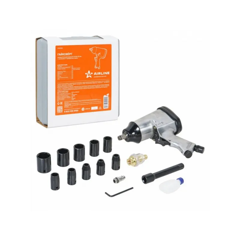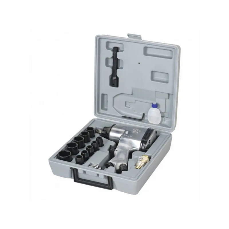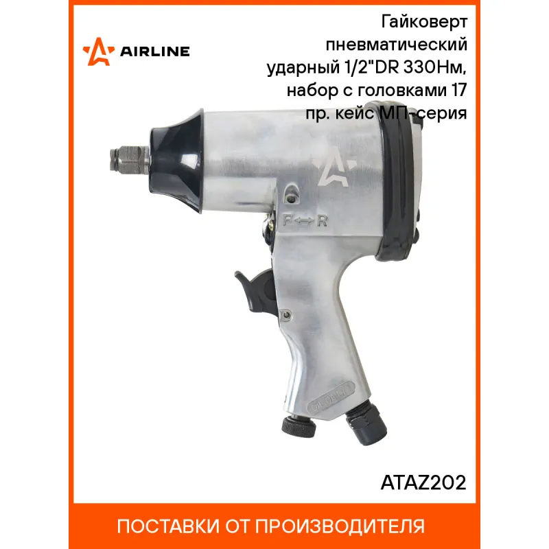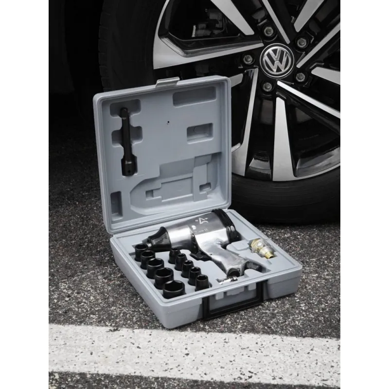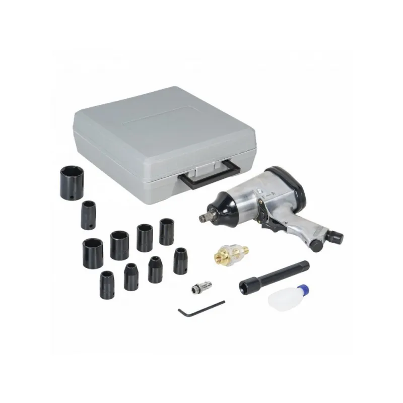 Гайковерт пневматический ударный 1/2"DR 330Нм, набор с головками 17 пр. кейс МП-серия Описание: Пневматический ударный гайковерт применяется для механизации слесарно-монтажных работ для затяжки (закручивания) или ослабления (откручивания) особонагруженных и осложненных резьбовых соединений с высокой скоростью, мощностью, дифференцированным крутящим моментом и низкими затратами энергии и физических сил оператора. Характеристики: Артикул: ATAZ202 Вес, кг: 2.15 Присоединительный квадрат: 1/2" Тип ударного механизма: Двойной молот (Twin Hammer) Диаметр присоединительного штуцера: 1/4" Частота вращения вала, об/мин: 7000 Рабочее давление воздуха, АТМ: 6.3 Расход воздуха, л/мин: 141 Макс. крутящий момент, Нм: 330 Комплектация: Гайковёрт - 1 шт Штуцер быстросъёмный 1/4" - 1 шт Головка торцевая (9, 10, 11, 13, 14, 17, 19, 22, 24, 27) - 10 шт Удлинитель 125мм - 1 шт Лубрикатор - 1 шт Маслёнка - 1 шт Паспорт - 1 шт Уплотнительное кольцо - 1 шт Кейс - 1 шт Гарантия: от 1 года.