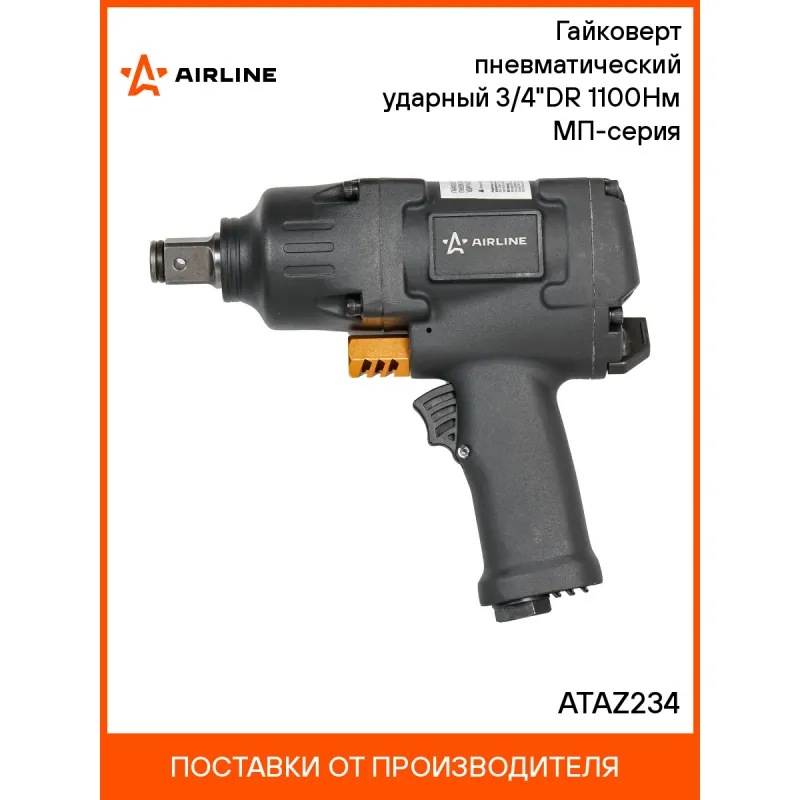 Гайковерт пневматический ударный 3/4"DR 1100Нм МП-серия Описание: Пневматический ударный гайковерт применяется для механизации слесарно-монтажных работ для затяжки (закручивания) или ослабления (откручивания) особонагруженных и осложненных резьбовых соединений с высокой скоростью, мощностью, дифференцированным крутящим моментом и низкими затратами энергии и физических сил оператора. Характеристики: Артикул: ATAZ234 Вес, кг: 3.1 Диаметр присоединительного штуцера: 1/4" Частота вращения вала, об/мин: 8000 Рабочее давление воздуха, АТМ: 6.3 Расход воздуха, л/мин: 270 Макс. крутящий момент, Нм: 1100 Максимальный размер крепежа: M24 Присоединительный квадрат: 3/4" Тип ударного механизма: Двойной молот (Twin Hammer) Комплектация: Гайковёрт пневматический - 1 шт Штуцер присоединительный - 1 шт Инструкция - 1 шт Маслёнка - 1 шт Гарантия: от 1 года.