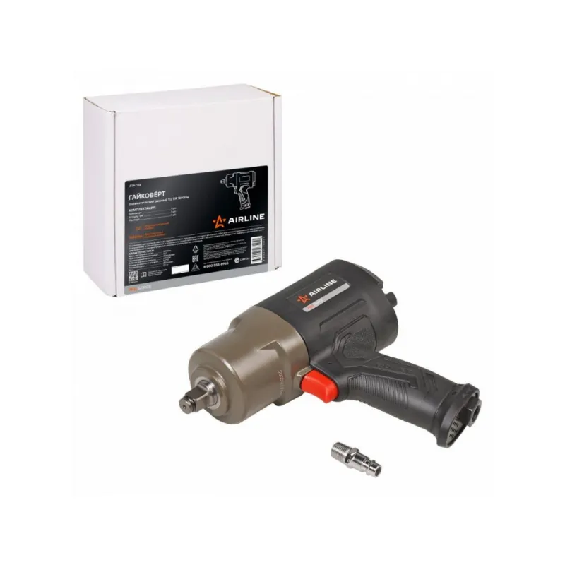 Гайковерт пневматический ударный композитный 1/2"DR 1890Нм PRO МП-серия Описание: Пневматический ударный гайковерт применяется для механизации слесарно-монтажных работ для затяжки (закручивания) или ослабления (откручивания) особонагруженных и осложненных резьбовых соединений с высокой скоростью, мощностью, дифференцированным крутящим моментом и низкими затратами энергии и физических сил оператора. Характеристики: Артикул: ATAZ214 Вес, кг: 2.2 Присоединительный квадрат: 1/2" Тип ударного механизма: Двойной молот (Twin Hammer) Диаметр присоединительного штуцера: 1/4" Частота вращения вала, об/мин: 8000 Рабочее давление воздуха, АТМ: 6.3 Расход воздуха, л/мин: 184 Макс. крутящий момент, Нм: 1890 Комплектация: Коробка - 1 шт Штуцер 1/4" - 1 шт Паспорт - 1 шт Гайковёрт - 1 шт Гарантия: от 1 года.