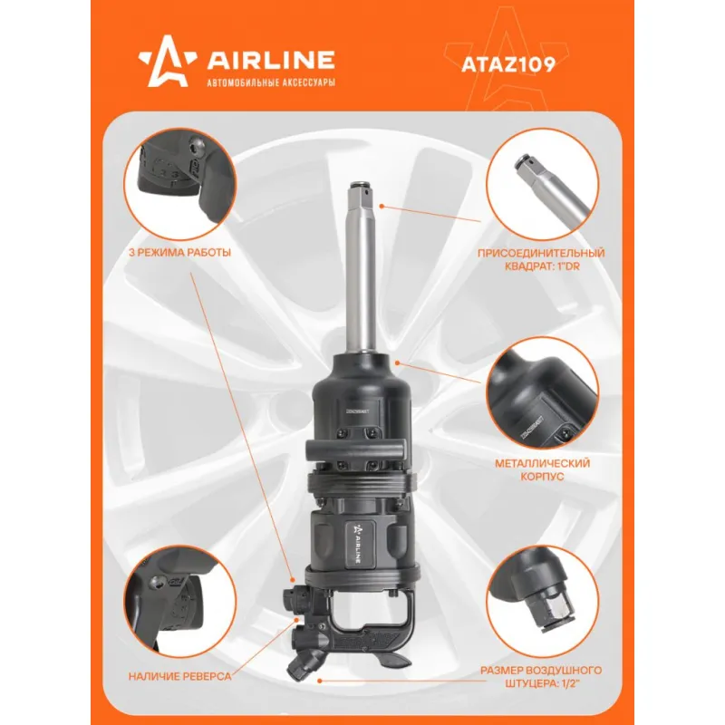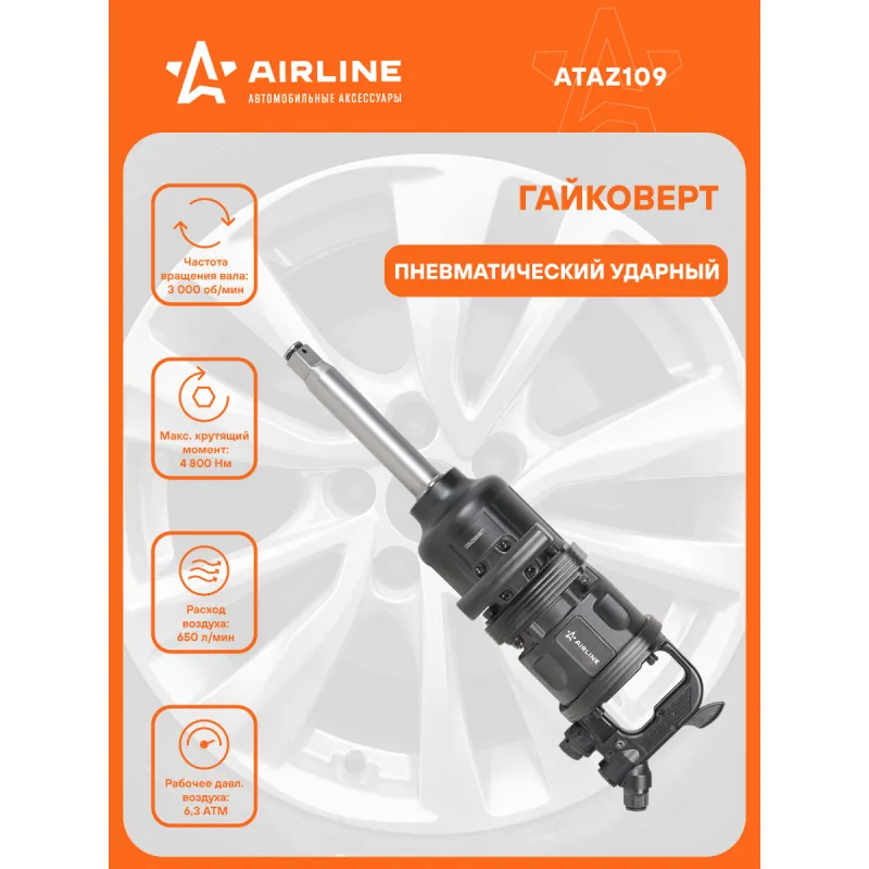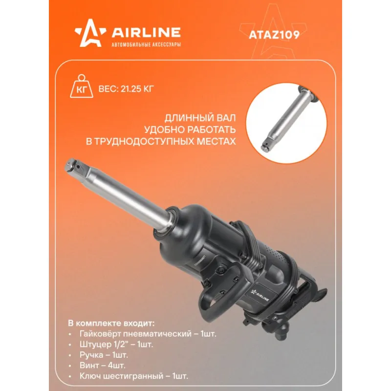 Гайковерт пневматический ударный 1"DR 4800Нм Описание: Пневматический ударный гайковерт 4800 Нм Airline ATAZ109 - незаменимый инструмент как для домашнего, так и для профессионального использования, применяется для механизации слесарно-монтажных работ для затяжки (закручивания) или ослабления (откручивания) особо нагруженных и осложненных резьбовых соединений с высокой скоростью, мощностью, дифференцированным крутящим моментом и низкими затратами энергии и физических сил оператора. Благодаря ударному механизму Twin Hammer изделие способно откручивать заржавевшие крепежные элементы. Корпус инструмента отличается повышенной прочностью и устойчивостью к механическим повреждениям. Работа на сжатом воздухе обеспечивает больший рабочий ресурс по сравнению с электродвигателем. Преимущества Airline ATAZ109: *Высокий момент затяжки. *Наличие удара - для мгновенного откручивания приржавевших и закисших гаек. *Инструмент устойчив к механическому износу. *Низкая пожаро- и взрывоопасность рабочего процесса благодаря работе на сжатом воздухе. Мощный и надежный, он пригодится для работы в мастерских и автосервисах, а также для бытового ремонта в домашнем гараже. Гайковерт ударный - это отличный вариант подарка любимому мужу, мужчине другу, папе, отчиму или коллеге! Характеристики: Артикул: ATAZ109 Вес, кг: 21 Присоединительный квадрат: 1" Тип ударного механизма: Двойной молот (Twin Hammer) Диаметр присоединительного штуцера: 1/2" Частота вращения вала, об/мин: 3000 Рабочее давление воздуха, АТМ: 6.3 Расход воздуха, л/мин: 650 Макс. крутящий момент, Нм: 4800 Комплектация: Ключ шестигранный - 1 шт Гайковёрт - 1 шт Паспорт - 1 шт Штуцер 1/2" - 1 шт Ручка - 1 шт Винт - 4 шт Гарантия: от 1 года.