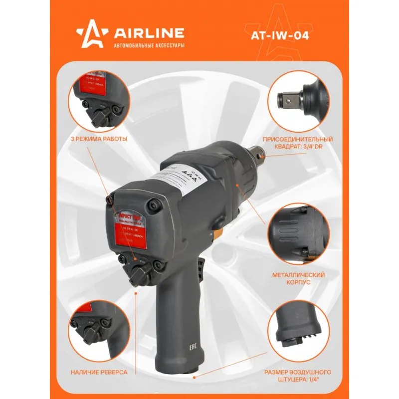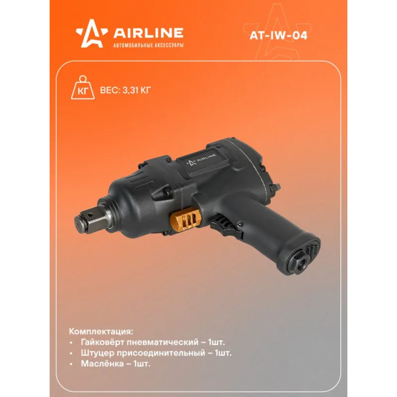 Гайковерт пневматический ударный 3/4"DR 1100Нм Описание: Пневматический ударный гайковерт 1100 Нм Airline AT-IW-04 - незаменимый инструмент как для домашнего, так и для профессионального использования, применяется для механизации слесарно-монтажных работ для затяжки (закручивания) или ослабления (откручивания) особо нагруженных и осложненных резьбовых соединений с высокой скоростью, мощностью, дифференцированным крутящим моментом и низкими затратами энергии и физических сил оператора. Благодаря ударному механизму Twin Hammer изделие способно откручивать заржавевшие крепежные элементы. Корпус инструмента отличается повышенной прочностью и устойчивостью к механическим повреждениям. Работа на сжатом воздухе обеспечивает больший рабочий ресурс по сравнению с электродвигателем. Пневмат гайковерт представляет из себя многоступенчатый редуктор, который многократно увеличивает крутящий момент прилагаемый к рукоятке, таким образом можно отвинтить гайки крепления колёс на грузовиках и специальной технике. Преимущества Airline AT-IW-04: *Высокий момент затяжки. *Наличие удара - для мгновенного откручивания приржавевших и закисших гаек. *Инструмент устойчив к механическому износу. *Airline AT-IW-04 можно работать даже в условиях повышенной влажности. *Низкая пожаро- и взрывоопасность рабочего процесса благодаря работе на сжатом воздухе. Гайковерт ударный - это отличный вариант подарка любимому мужу, мужчине другу, папе, отчиму или коллеге! Мощный и надежный, он пригодится для работы в мастерских и автосервисах, а также для бытового ремонта в домашнем гараже. Характеристики: Артикул: AT-IW-04 OEM номера: JAI-6211 Вес, кг: 3.1 Диаметр присоединительного штуцера: 1/4" Частота вращения вала, об/мин: 8000 Рабочее давление воздуха, АТМ: 6.3 Расход воздуха, л/мин: 270 Макс. крутящий момент, Нм: 1100 Максимальный размер крепежа: M24 Присоединительный квадрат: 3/4" Тип ударного механизма: Двойной молот (Twin Hammer) Комплектация: Гайковёрт пневматический - 1 шт Штуцер присоединительный - 1 шт Инструкция - 1 шт Маслёнка - 1 шт Гарантия: от 1 года.