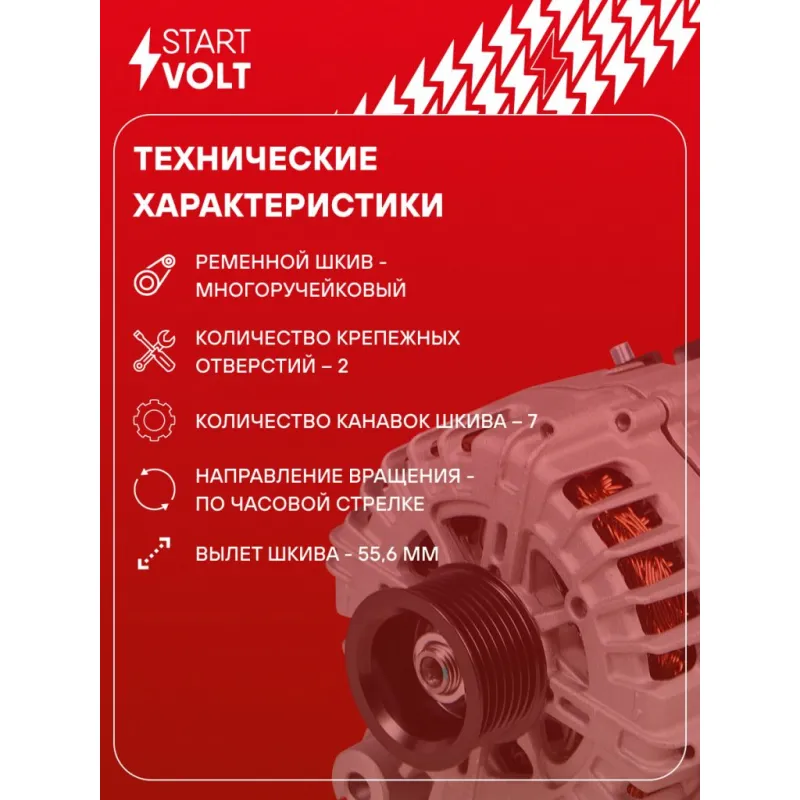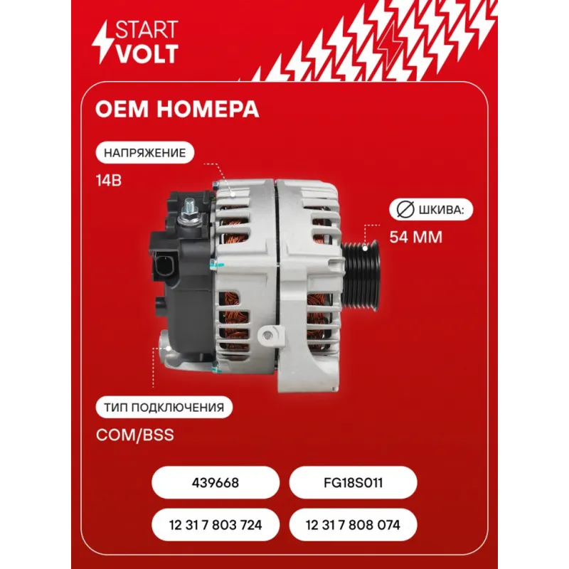 Генератор для автомобилей BMW X5 E70 (10-)/5 F10 (11-)/X6 E71 (09-) 3.0D 180A Описание: Оригинальный генератор STARTVOLT LG 2633 рассчитан на ток 180 А и напряжение 14 В. Изготовлен аналогично оригинальной конструкции. с многоручейковым ручейковым шкивом шкив (7PK, диаметр 54 мм) полностью совместим с оригинальными агрегатами. Подходит для автомобилей: BMW 5, 7, X5, X6.. Если у вас есть вопросы по применяемости, мы всегда готовы помочь вам с подбором по VIN-НОМЕРУ ВАШЕГО АВТОМОБИЛЯ. Преимущества: - Полностью соответствует оригинальным узлам; - Высокоточная сборка с пооперационным контролем качества; - Каждый генератор проходит стендовое тестирование — протокол в комплекте; - Надёжность в любых условиях эксплуатации; - STARTVOLT 15 лет на рынке автоэлектрики — нам доверяют профессионалы; - Гарантия 2 года; - Сертифицирован по стандарту EAC (ЕАЭС) — соответствует требованиям безопасности и качества; Автомобильный генератор в сборе — готов к установке. Отличный выбор для надежной замены штатного генератора. Характеристики: Артикул: LG 2633 OEM номера: 12 31 7 803 724, 12 31 7 808 074, 439668, FG18S011 IDE код: 53 Напряжение, В: 14 Выходной ток, А: 180 Тип подключения: COM/BSS Диаметр шкива, мм: 54 Ременной шкив: с многоручейковым ручейковым шкивом Количество крепежных отверстий: 2 Количество канавок шкива: 7 Направление вращения: По часовой стрелке Вылет шкива, мм: 55,6 Комплектация: Генератор - 1 шт Индивидуальный технический паспорт изделия (с фирменным ID) - 1 шт Паспорт изделия/гарантийный талон - 1 шт Гарантия: от 1 года.