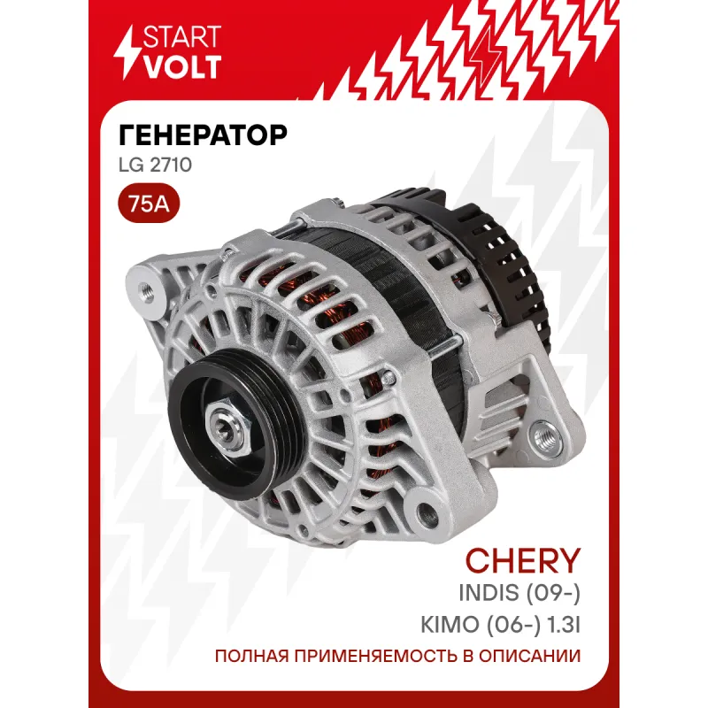 Генератор для автомобилей Chery Indis (09-)/Kimo (06-) 1.3i 75A Описание: Оригинальный генератор STARTVOLT LG 2710 рассчитан на ток 75 А и напряжение 14 В. Изготовлен аналогично оригинальной конструкции. с многоручейковым ручейковым шкивом шкив (4PK, диаметр 57,5 мм) полностью совместим с оригинальными агрегатами. Подходит для автомобилей: CHERY INDIS, SWEET (QQ), KIMO / A1, QQ6.. Если у вас есть вопросы по применяемости, мы всегда готовы помочь вам с подбором по VIN-НОМЕРУ ВАШЕГО АВТОМОБИЛЯ. Преимущества: - Полностью соответствует оригинальным узлам; - Высокоточная сборка с пооперационным контролем качества; - Каждый генератор проходит стендовое тестирование — протокол в комплекте; - Надёжность в любых условиях эксплуатации; - STARTVOLT 15 лет на рынке автоэлектрики — нам доверяют профессионалы; - Гарантия 2 года; - Сертифицирован по стандарту EAC (ЕАЭС) — соответствует требованиям безопасности и качества; Автомобильный генератор в сборе — готов к установке. Отличный выбор для надежной замены штатного генератора. Характеристики: Артикул: LG 2710 OEM номера: S11-3701110FA, S113701110BA, S113701110, S113701110B1, S113701110BB, S123701110BB Напряжение, В: 14 Выходной ток, А: 75 Тип подключения: L-IG Диаметр шкива, мм: 57,5 Ременной шкив: с многоручейковым ручейковым шкивом Количество крепежных отверстий: 2 Количество канавок шкива: 4 Направление вращения: По часовой стрелке Вылет шкива, мм: 49,6 Комплектация: Генератор - 1 шт Индивидуальный технический паспорт изделия (с фирменным ID) - 1 шт Паспорт изделия/гарантийный талон - 1 шт Гарантия: от 1 года.