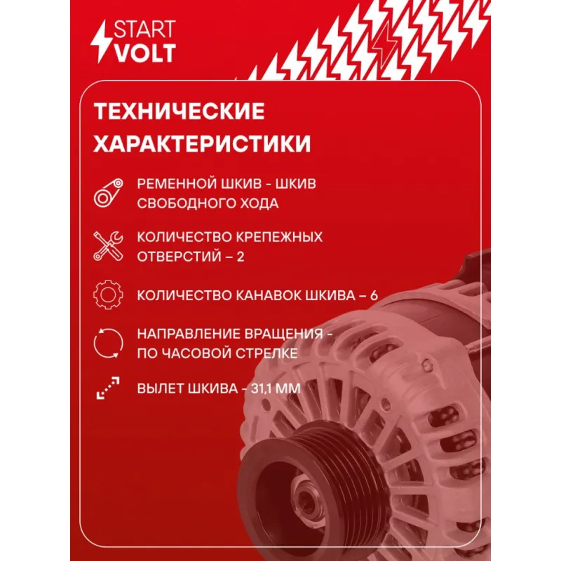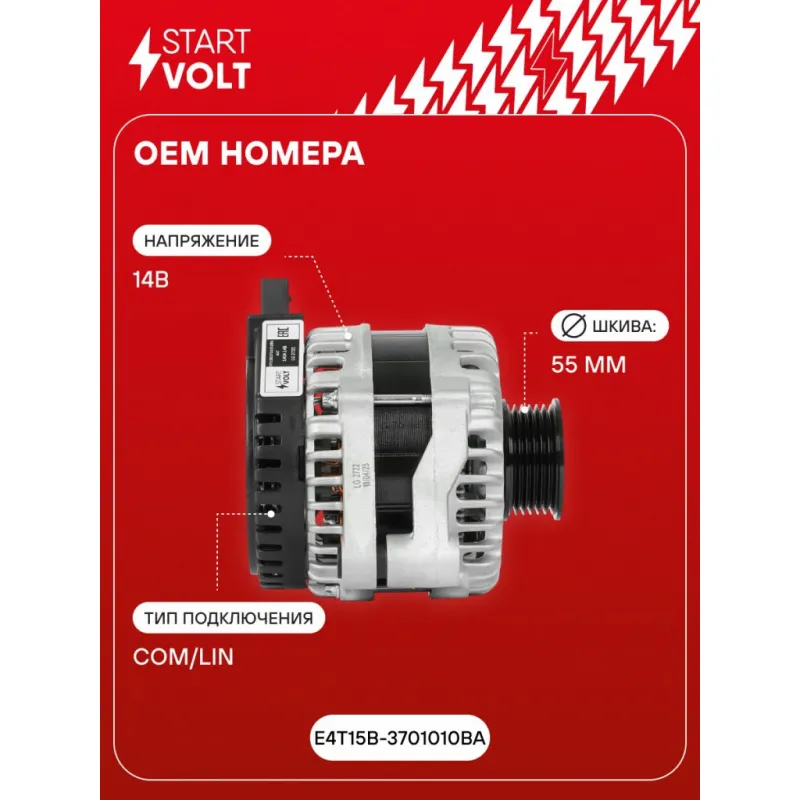 Генератор для автомобилей Chery Tiggo 8 (18-) 1.5T 140A Описание: Оригинальный генератор STARTVOLT LG 2722 рассчитан на ток 140 А и напряжение 14 В. Изготовлен аналогично оригинальной конструкции. Шкив свободного хода (6PK, диаметр 55 мм) полностью совместим с оригинальными агрегатами. Подходит для автомобилей: CHERY TIGGO 8.. Если у вас есть вопросы по применяемости, мы всегда готовы помочь вам с подбором по VIN-НОМЕРУ ВАШЕГО АВТОМОБИЛЯ. Преимущества: - Полностью соответствует оригинальным узлам; - Высокоточная сборка с пооперационным контролем качества; - Каждый генератор проходит стендовое тестирование — протокол в комплекте; - Надёжность в любых условиях эксплуатации; - STARTVOLT 15 лет на рынке автоэлектрики — нам доверяют профессионалы; - Гарантия 2 года; - Сертифицирован по стандарту EAC (ЕАЭС) — соответствует требованиям безопасности и качества; Автомобильный генератор в сборе — готов к установке. Отличный выбор для надежной замены штатного генератора. Характеристики: Артикул: LG 2722 OEM номера: E4T15B-3701010BA Направление вращения: По часовой стрелке Выходной ток, А: 140 Напряжение, В: 14 Вылет шкива, мм: 31,1 Тип подключения: COM/LIN Диаметр шкива, мм: 55 Ременной шкив: с ременным шкивом свободного хода Количество крепежных отверстий: 2 Количество канавок шкива: 6 IDE код: 31 Скорость сигнала: LMH Комплектация: Индивидуальный технический паспорт изделия (с фирменным ID) - 1 шт Генератор - 1 шт Паспорт изделия/гарантийный талон - 1 шт Гарантия: от 1 года.