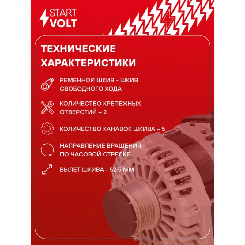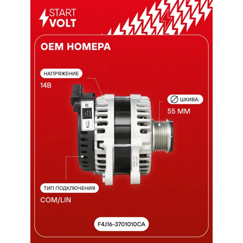 Генератор для автомобилей Chery Tiggo 8 Pro (18-)/Exeed TXL (16-)/VX (16-) 1.6T/2.0T 140A Описание: Оригинальный генератор STARTVOLT LG 2723 рассчитан на ток 140 А и напряжение 14 В. Изготовлен аналогично оригинальной конструкции. Шкив свободного хода (5PK, диаметр 55 мм) полностью совместим с оригинальными агрегатами. Подходит для автомобилей: CHERY TIGGO 8, EXEED (CHERY) TXL, VX, JETOUR DASHING, OMODA C5.. Если у вас есть вопросы по применяемости, мы всегда готовы помочь вам с подбором по VIN-НОМЕРУ ВАШЕГО АВТОМОБИЛЯ. Преимущества: - Полностью соответствует оригинальным узлам; - Высокоточная сборка с пооперационным контролем качества; - Каждый генератор проходит стендовое тестирование — протокол в комплекте; - Надёжность в любых условиях эксплуатации; - STARTVOLT 15 лет на рынке автоэлектрики — нам доверяют профессионалы; - Гарантия 2 года; - Сертифицирован по стандарту EAC (ЕАЭС) — соответствует требованиям безопасности и качества; Автомобильный генератор в сборе — готов к установке. Отличный выбор для надежной замены штатного генератора. Характеристики: Артикул: LG 2723 OEM номера: F4J16-3701010CA Направление вращения: По часовой стрелке Выходной ток, А: 140 Напряжение, В: 14 Вылет шкива, мм: 52,5 Тип подключения: COM/LIN Диаметр шкива, мм: 55 Ременной шкив: с ременным шкивом свободного хода Количество крепежных отверстий: 2 Количество канавок шкива: 5 IDE код: 31 Скорость сигнала: LMH Комплектация: Генератор - 1 шт Паспорт изделия/гарантийный талон - 1 шт Индивидуальный технический паспорт изделия (с фирменным ID) - 1 шт Гарантия: от 1 года.