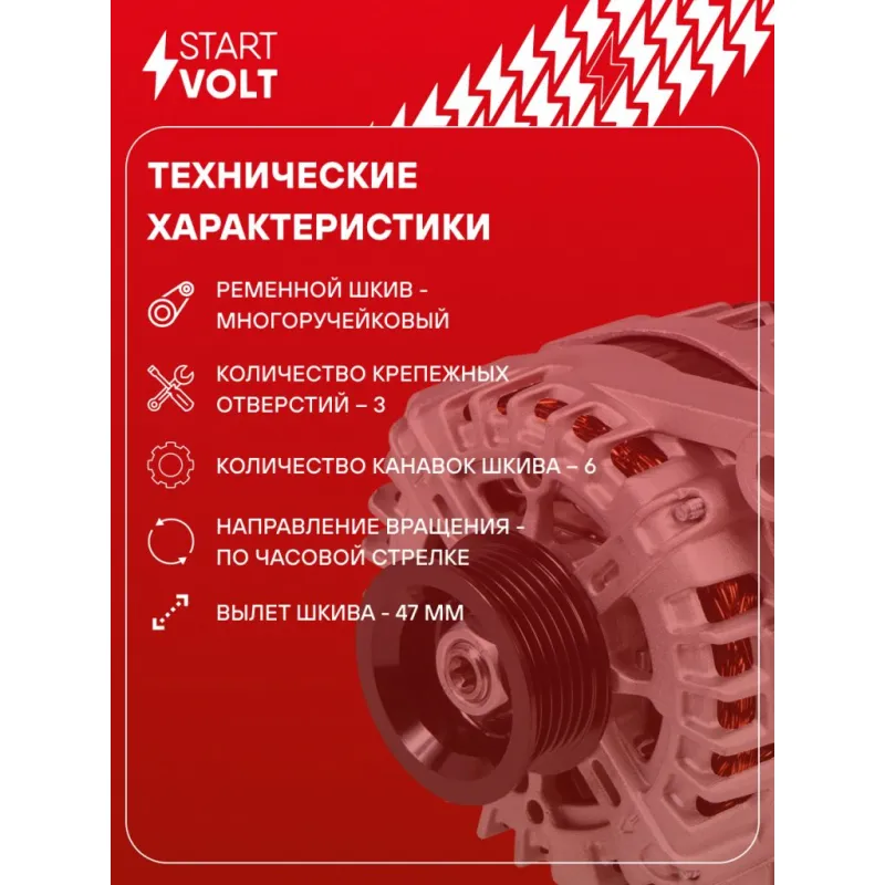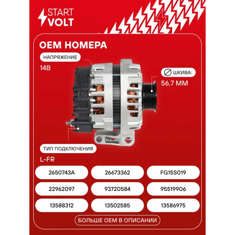 Генератор для автомобилей Chevrolet Captiva C140 (10-)/Opel Antara (10-) 3.0i 150A Описание: Оригинальный генератор STARTVOLT LG 0508 рассчитан на ток 150 А и напряжение 14 В. Изготовлен аналогично оригинальной конструкции. с многоручейковым ручейковым шкивом шкив (6PK, диаметр 56,7 мм) полностью совместим с оригинальными агрегатами. Подходит для автомобилей: CHEVROLET CAPTIVA, OPEL ANTARA.. Если у вас есть вопросы по применяемости, мы всегда готовы помочь вам с подбором по VIN-НОМЕРУ ВАШЕГО АВТОМОБИЛЯ. Преимущества: - Полностью соответствует оригинальным узлам; - Высокоточная сборка с пооперационным контролем качества; - Каждый генератор проходит стендовое тестирование — протокол в комплекте; - Надёжность в любых условиях эксплуатации; - STARTVOLT 15 лет на рынке автоэлектрики — нам доверяют профессионалы; - Гарантия 2 года; - Сертифицирован по стандарту EAC (ЕАЭС) — соответствует требованиям безопасности и качества; Автомобильный генератор в сборе — готов к установке. Отличный выбор для надежной замены штатного генератора. Характеристики: Артикул: LG 0508 OEM номера: 13588312, 13502585, 13586975, 22962097, 93720584, 95519906, 2650743A, 26673362, FG15S019, FG15S084, FG15S094, FG15S097, FG15S100 Напряжение, В: 14 Выходной ток, А: 150 Тип подключения: L-FR Диаметр шкива, мм: 56,7 Ременной шкив: с многоручейковым ручейковым шкивом Количество крепежных отверстий: 3 Количество канавок шкива: 6 Направление вращения: По часовой стрелке Вылет шкива, мм: 47 Комплектация: Индивидуальный технический паспорт изделия (с фирменным ID) - 1 шт Паспорт изделия/гарантийный талон - 1 шт Генератор - 1 шт Гарантия: от 1 года.