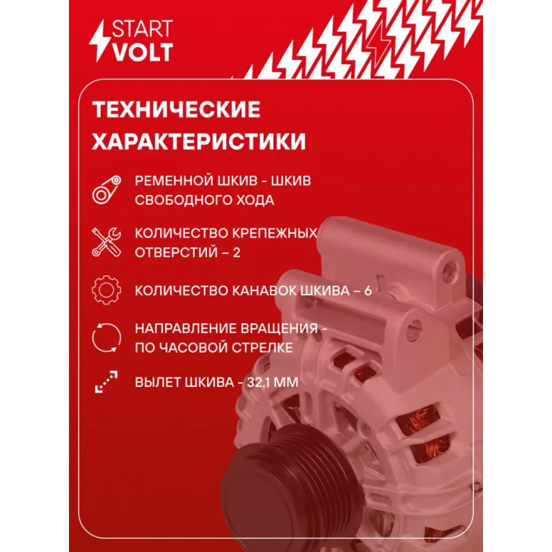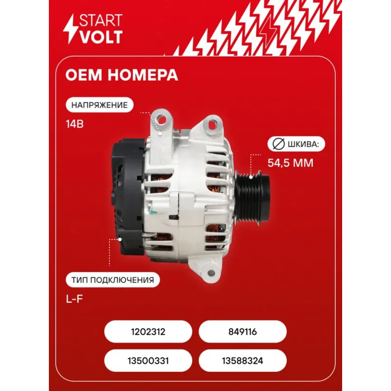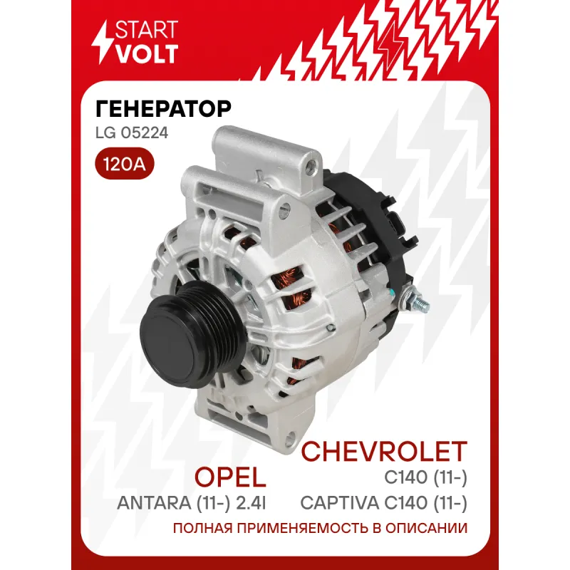 Генератор для автомобилей Chevrolet Captiva C140 (11-)/Opel Antara (11-) 2.4i MT 120A Описание: Оригинальный генератор STARTVOLT LG 05224 рассчитан на ток 120 А и напряжение 14 В. Изготовлен аналогично оригинальной конструкции. Шкив свободного хода (6PK, диаметр 54,5 мм) полностью совместим с оригинальными агрегатами. Подходит для автомобилей: CHEVROLET CAPTIVA, MALIBU, OPEL ANTARA, INSIGNIA, SAAB 9-5.. Если у вас есть вопросы по применяемости, мы всегда готовы помочь вам с подбором по VIN-НОМЕРУ ВАШЕГО АВТОМОБИЛЯ. Преимущества: - Полностью соответствует оригинальным узлам; - Высокоточная сборка с пооперационным контролем качества; - Каждый генератор проходит стендовое тестирование — протокол в комплекте; - Надёжность в любых условиях эксплуатации; - STARTVOLT 15 лет на рынке автоэлектрики — нам доверяют профессионалы; - Гарантия 2 года; - Сертифицирован по стандарту EAC (ЕАЭС) — соответствует требованиям безопасности и качества; Автомобильный генератор в сборе — готов к установке. Отличный выбор для надежной замены штатного генератора. Характеристики: Артикул: LG 05224 OEM номера: 13500331, 13588324, 1202312, 849116 Напряжение, В: 14 Выходной ток, А: 120 Тип подключения: L-F Диаметр шкива, мм: 54,5 Ременной шкив: с ременным шкивом свободного хода Количество крепежных отверстий: 2 Количество канавок шкива: 6 Направление вращения: По часовой стрелке Вылет шкива, мм: 32,1 Сопутствующий товар: Регуляторы напряжения генераторов: VRR 05224 Сопутствующий товар: Шкивы генераторов с обгонной муфтой: SGP 05224 Подходит для авто: Chevrolet Captiva (06-) Opel Antara (06-), Insignia (08-) Для проверки применяемости отправьте VIN автомобиля через вкладку "Есть вопросы о товаре?" Комплектация: Генератор - 1 шт Паспорт изделия/гарантийный талон - 1 шт Индивидуальный технический паспорт изделия (с фирменным ID) - 1 шт Гарантия: от 1 года.