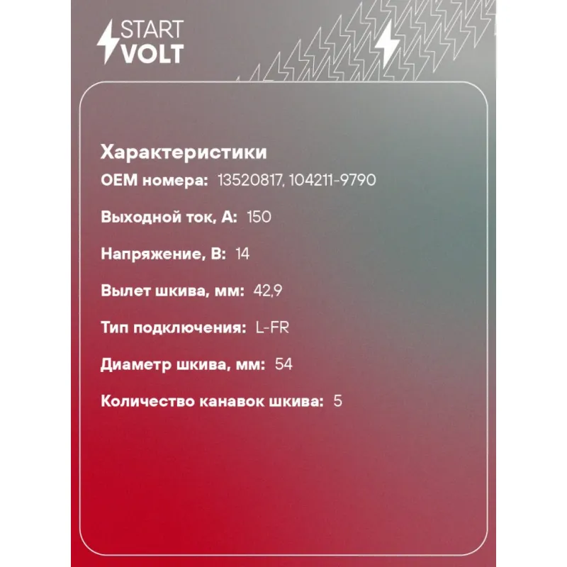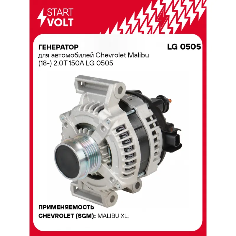 Генератор для автомобилей Chevrolet Malibu (18-) 2.0T 150A Описание: Оригинальный генератор STARTVOLT LG 0505 рассчитан на ток 150 А и напряжение 14 В. Изготовлен аналогично оригинальной конструкции. Шкив свободного хода (5PK, диаметр 54 мм) полностью совместим с оригинальными агрегатами. Подходит для автомобилей: CHEVROLET MALIBU.. Если у вас есть вопросы по применяемости, мы всегда готовы помочь вам с подбором по VIN-НОМЕРУ ВАШЕГО АВТОМОБИЛЯ. Преимущества: - Полностью соответствует оригинальным узлам; - Высокоточная сборка с пооперационным контролем качества; - Каждый генератор проходит стендовое тестирование — протокол в комплекте; - Надёжность в любых условиях эксплуатации; - STARTVOLT 15 лет на рынке автоэлектрики — нам доверяют профессионалы; - Гарантия 2 года; - Сертифицирован по стандарту EAC (ЕАЭС) — соответствует требованиям безопасности и качества; Автомобильный генератор в сборе — готов к установке. Отличный выбор для надежной замены штатного генератора. Характеристики: Артикул: LG 0505 OEM номера: 13520817, 104211-9790 Направление вращения: По часовой стрелке Выходной ток, А: 150 Напряжение, В: 14 Вылет шкива, мм: 42,9 Тип подключения: L-FR Диаметр шкива, мм: 54 Ременной шкив: с ременным шкивом свободного хода Количество крепежных отверстий: 3 Количество канавок шкива: 5 Комплектация: Генератор - 1 шт Паспорт изделия/гарантийный талон - 1 шт Индивидуальный технический паспорт изделия (с фирменным ID) - 1 шт Гарантия: от 1 года.