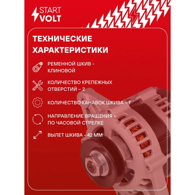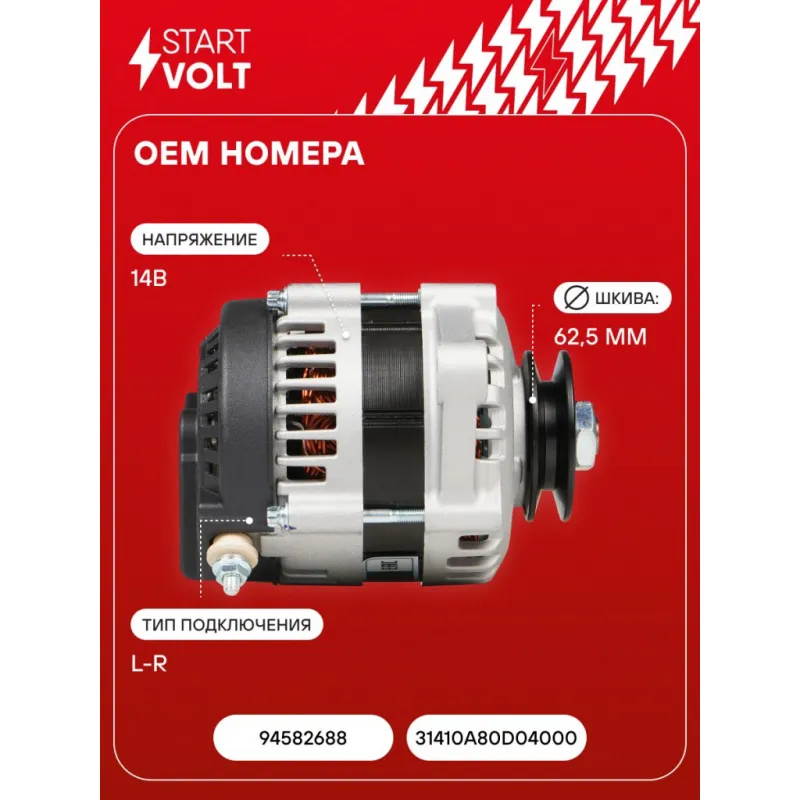 Генератор для автомобилей Daewoo Damas (91-) 0.8i 40A Описание: Оригинальный генератор STARTVOLT LG 0504 рассчитан на ток 40 А и напряжение 14 В. Изготовлен аналогично оригинальной конструкции. с ремённым шкивом шкив (диаметр 62,5 мм) полностью совместим с оригинальными агрегатами. Подходит для автомобилей: DAEWOO DAMAS.. Если у вас есть вопросы по применяемости, мы всегда готовы помочь вам с подбором по VIN-НОМЕРУ ВАШЕГО АВТОМОБИЛЯ. Преимущества: - Полностью соответствует оригинальным узлам; - Высокоточная сборка с пооперационным контролем качества; - Каждый генератор проходит стендовое тестирование — протокол в комплекте; - Надёжность в любых условиях эксплуатации; - STARTVOLT 15 лет на рынке автоэлектрики — нам доверяют профессионалы; - Гарантия 2 года; - Сертифицирован по стандарту EAC (ЕАЭС) — соответствует требованиям безопасности и качества; Автомобильный генератор в сборе — готов к установке. Отличный выбор для надежной замены штатного генератора. Характеристики: Артикул: LG 0504 OEM номера: 94582688, 31410A80D04000 Направление вращения: По часовой стрелке Выходной ток, А: 40 Напряжение, В: 14 Вылет шкива, мм: 42 Тип подключения: L-R Диаметр шкива, мм: 62,5 Ременной шкив: с ремённым шкивом Количество крепежных отверстий: 2 Количество канавок шкива: 1 Комплектация: Паспорт изделия/гарантийный талон - 1 шт Индивидуальный технический паспорт изделия (с фирменным ID) - 1 шт Генератор - 1 шт Гарантия: от 1 года.