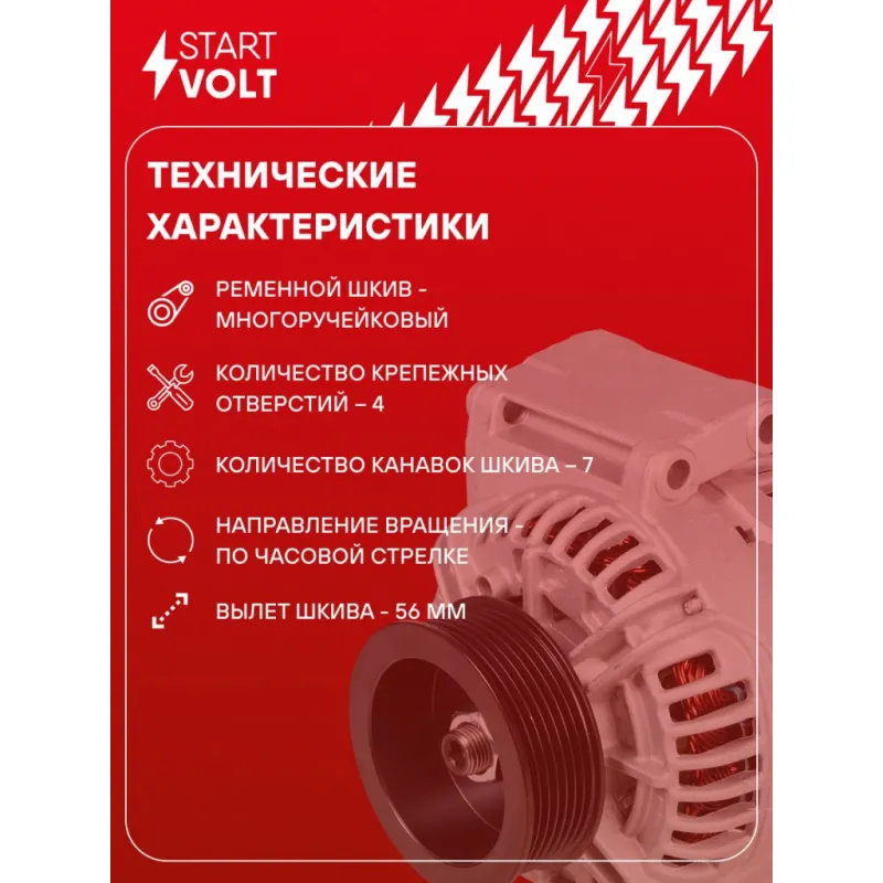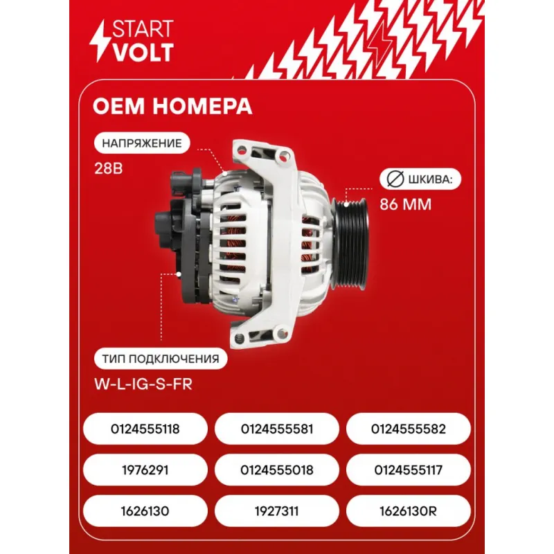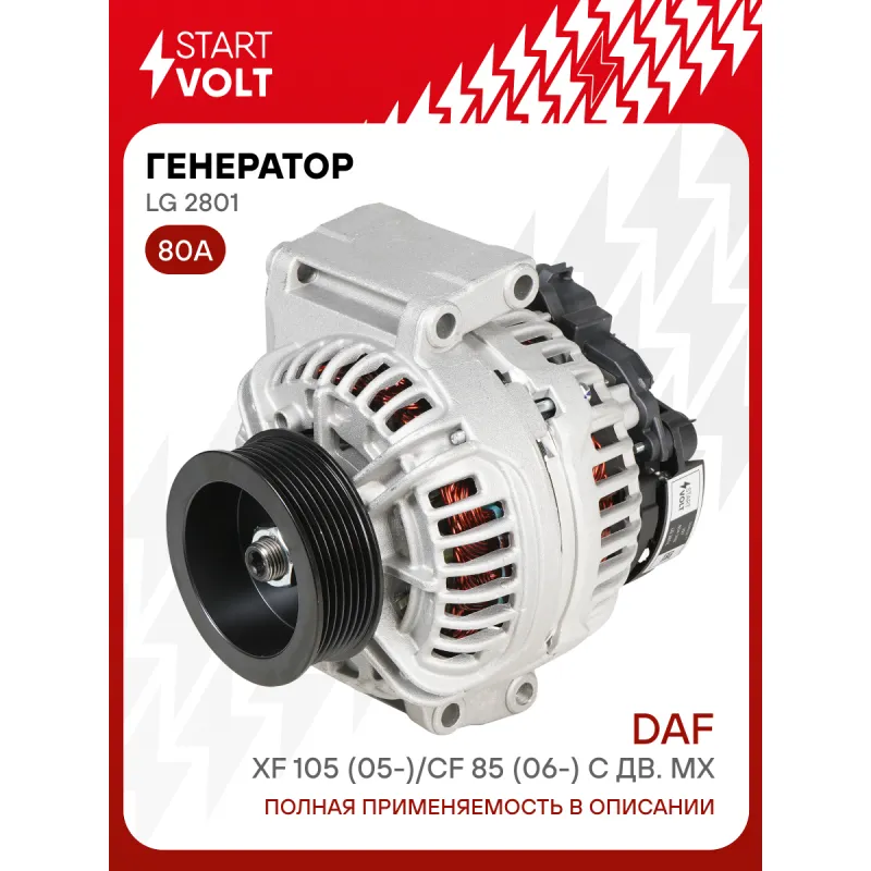 Генератор для автомобилей DAF XF 105 (05-)/CF 85 (06-) с дв. MX 340 80A Описание: Оригинальный генератор STARTVOLT LG 2801 рассчитан на ток 80 А и напряжение 28 В. Изготовлен аналогично оригинальной конструкции. с многоручейковым ручейковым шкивом шкив (7PK, диаметр 86 мм) полностью совместим с оригинальными агрегатами. Подходит для автомобилей: DAF CF 85, XF 105.. Если у вас есть вопросы по применяемости, мы всегда готовы помочь вам с подбором по VIN-НОМЕРУ ВАШЕГО АВТОМОБИЛЯ. Преимущества: - Полностью соответствует оригинальным узлам; - Высокоточная сборка с пооперационным контролем качества; - Каждый генератор проходит стендовое тестирование — протокол в комплекте; - Надёжность в любых условиях эксплуатации; - STARTVOLT 15 лет на рынке автоэлектрики — нам доверяют профессионалы; - Гарантия 2 года; - Сертифицирован по стандарту EAC (ЕАЭС) — соответствует требованиям безопасности и качества; Автомобильный генератор в сборе — готов к установке. Отличный выбор для надежной замены штатного генератора. Характеристики: Артикул: LG 2801 OEM номера: 1626130, 1927311, 1626130R, 1976291, 0124555018, 0124555117, 0124555118, 0124555581, 0124555582 Направление вращения: По часовой стрелке Выходной ток, А: 80 Напряжение, В: 28 Вылет шкива, мм: 56 Тип подключения: W-L-IG-S-FR Диаметр шкива, мм: 86 Ременной шкив: с многоручейковым ручейковым шкивом Количество крепежных отверстий: 4 Количество канавок шкива: 7 Комплектация: Генератор - 1 шт Паспорт изделия/гарантийный талон - 1 шт Индивидуальный технический паспорт изделия (с фирменным ID) - 1 шт Гарантия: от 1 года.