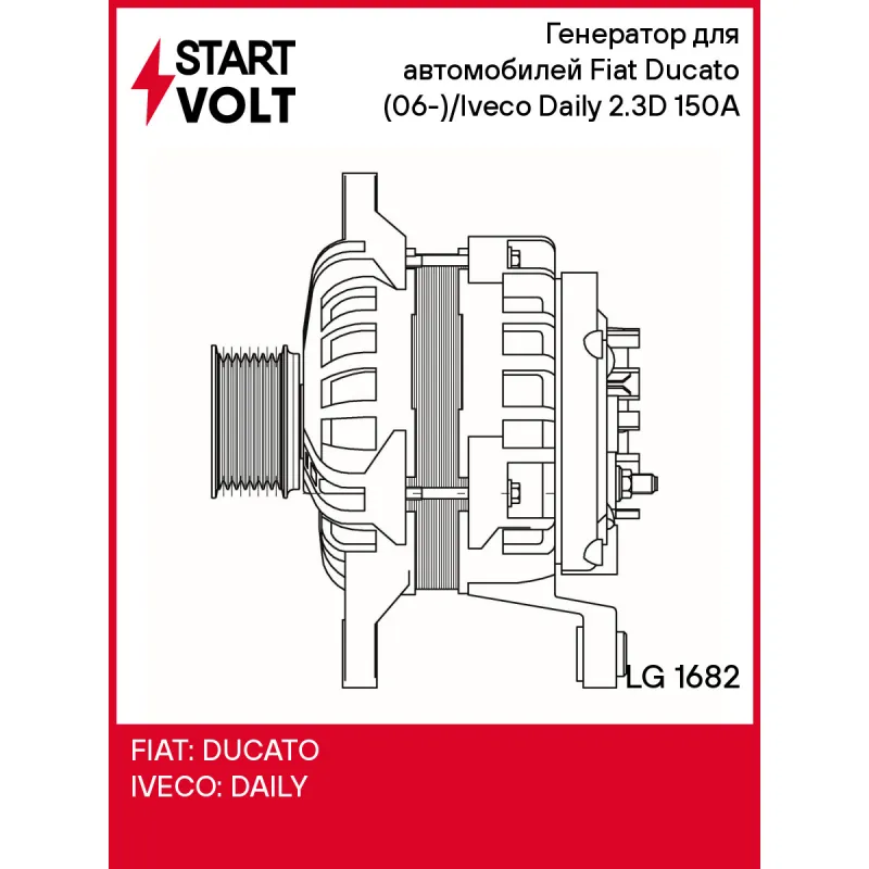 Генератор для автомобилей Fiat Ducato (06-)/Iveco Daily (06-) 2.3D 150A Характеристики: Артикул: LG 1682 OEM номера: 504385134, F 000 BL0 7P9, 0986083760, 1986A01088, F000BL0705, F000BL07CA, F000BL07CB Направление вращения: по часовой стрелке Выходной ток, А: 150 Напряжение, В: 14 Вылет шкива, мм: 41 Тип подключения: L-DFM Диаметр шкива, мм: 55 Ременной шкив: с многоручейковым ручейковым шкивом Количество крепежных отверстий: 2 Количество канавок шкива: 7 Сопутствующий товар: Регуляторы напряжения генераторов: VRR 0190 Комплектация: Индивидуальный технический паспорт изделия (с фирменным ID) - 1 шт Паспорт изделия/гарантийный талон - 1 шт Генератор - 1 шт Гарантия: от 1 года.