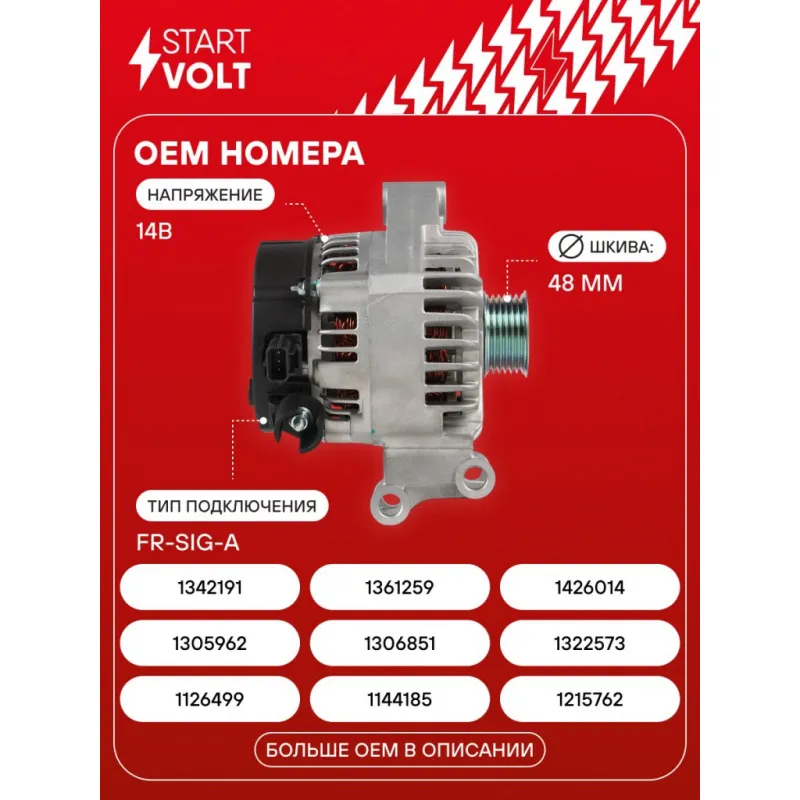 Генератор для автомобилей Ford Focus II (04-)/Fusion (02-)/Fiesta (01-) 1.4i/1.6i 105А Описание: Оригинальный генератор STARTVOLT LG 1079 рассчитан на ток 105 А и напряжение 14 В. Изготовлен аналогично оригинальной конструкции. с многоручейковым ручейковым шкивом шкив (6PK, диаметр 48 мм) полностью совместим с оригинальными агрегатами. Подходит для автомобилей: FORD FOCUS, FUSION, C-MAX, FIESTA.. Если у вас есть вопросы по применяемости, мы всегда готовы помочь вам с подбором по VIN-НОМЕРУ ВАШЕГО АВТОМОБИЛЯ. Преимущества: - Полностью соответствует оригинальным узлам; - Высокоточная сборка с пооперационным контролем качества; - Каждый генератор проходит стендовое тестирование — протокол в комплекте; - Надёжность в любых условиях эксплуатации; - STARTVOLT 15 лет на рынке автоэлектрики — нам доверяют профессионалы; - Гарантия 2 года; - Сертифицирован по стандарту EAC (ЕАЭС) — соответствует требованиям безопасности и качества; Автомобильный генератор в сборе — готов к установке. Отличный выбор для надежной замены штатного генератора. Характеристики: Артикул: LG 1079 OEM номера: 1126499, 1144185, 1215762, 1305962, 1306851, 1322573, 1342191, 1361259, 1426014, 1511220, 1708472, 1748637, 3N1110300AB, 3N1110300AC, 3N1110300AD, 3N1110300AE, 3N1110300AF, 3N1110300AG, RE3N11-10300-AF, YS4D-10300-AA, YS4D-10300-AB, YS4D-10300-AC, YS4D-10300-AD, YS4D-10300-AE, YS4D-10300-AF, YS4D-10300-AG, YS4D-10300-AH, YS4D-10300-AJ, DAN588 Напряжение, В: 14 Выходной ток, А: 105 Тип подключения: FR-SIG-A Диаметр шкива, мм: 48 Ременной шкив: с многоручейковым ручейковым шкивом Количество крепежных отверстий: 2 Количество канавок шкива: 6 Направление вращения: По часовой стрелке Вылет шкива, мм: 10 Сопутствующий товар: Регуляторы напряжения генераторов: VRR 1071 Сопутствующий товар: Мосты диодные генераторов: VDB 1071 Подходит для авто: Ford Fusion (02-), C-Max (03-), Focus II (05-), Focus I (98-) Для проверки применяемости отправьте VIN автомобиля через вкладку "Есть вопросы о товаре?" Комплектация: Генератор - 1 шт Паспорт изделия/гарантийный талон - 1 шт Индивидуальный технический паспорт изделия (с фирменным ID) - 1 шт Гарантия: от 1 года.