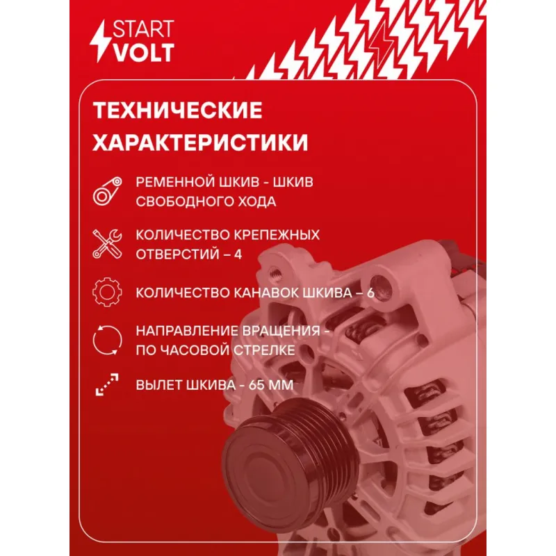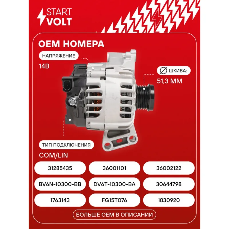 Генератор для автомобилей Ford Kuga II (13-) 1.6T/S-Max (06-) 2.0i 150A Описание: Оригинальный генератор STARTVOLT LG 1009 рассчитан на ток 150 А и напряжение 14 В. Изготовлен аналогично оригинальной конструкции. Шкив свободного хода (6PK, диаметр 51,3 мм) полностью совместим с оригинальными агрегатами. Подходит для автомобилей: FORD C-MAX, S-MAX, GALAXY, MONDEO, FOCUS, TRANSIT CONNECT, KUGA, VOLVO V40, S60, S80, V70, V60.. Если у вас есть вопросы по применяемости, мы всегда готовы помочь вам с подбором по VIN-НОМЕРУ ВАШЕГО АВТОМОБИЛЯ. Преимущества: - Полностью соответствует оригинальным узлам; - Высокоточная сборка с пооперационным контролем качества; - Каждый генератор проходит стендовое тестирование — протокол в комплекте; - Надёжность в любых условиях эксплуатации; - STARTVOLT 15 лет на рынке автоэлектрики — нам доверяют профессионалы; - Гарантия 2 года; - Сертифицирован по стандарту EAC (ЕАЭС) — соответствует требованиям безопасности и качества; Автомобильный генератор в сборе — готов к установке. Отличный выбор для надежной замены штатного генератора. Характеристики: Артикул: LG 1009 OEM номера: 1763143, FG15T076, 1830920, BV6N-10300-BB, DV6T-10300-BA, 30644798, 31285435, 36001101, 36002122, 1704927, 439915 IDE код: 25 Скорость сигнала: LMH Напряжение, В: 14 Выходной ток, А: 150 Тип подключения: COM/LIN Диаметр шкива, мм: 51,3 Ременной шкив: с ременным шкивом свободного хода Количество крепежных отверстий: 4 Количество канавок шкива: 6 Направление вращения: По часовой стрелке Вылет шкива, мм: 65 Подходит для авто: Ford Kuga (13-) Для проверки применяемости отправьте VIN автомобиля через вкладку "Есть вопросы о товаре?" Комплектация: Индивидуальный технический паспорт изделия (с фирменным ID) - 1 шт Паспорт изделия/гарантийный талон - 1 шт Генератор - 1 шт Гарантия: от 1 года.