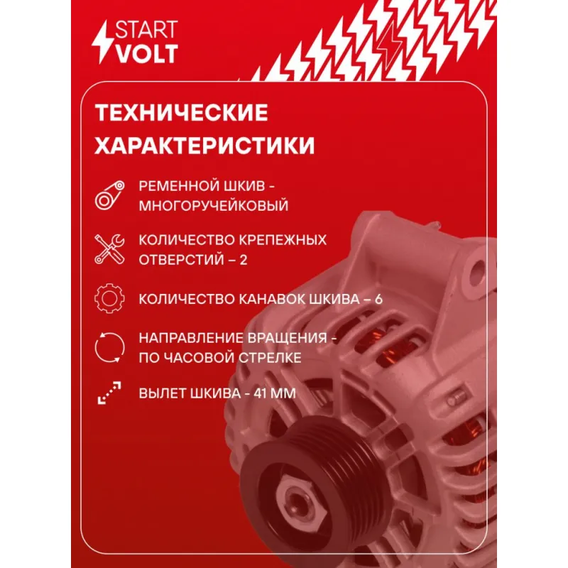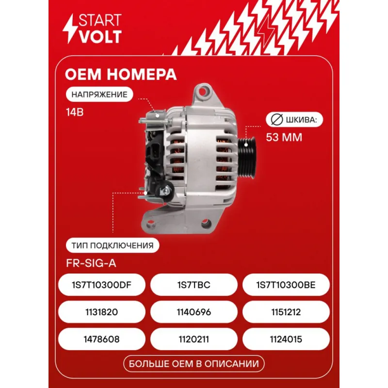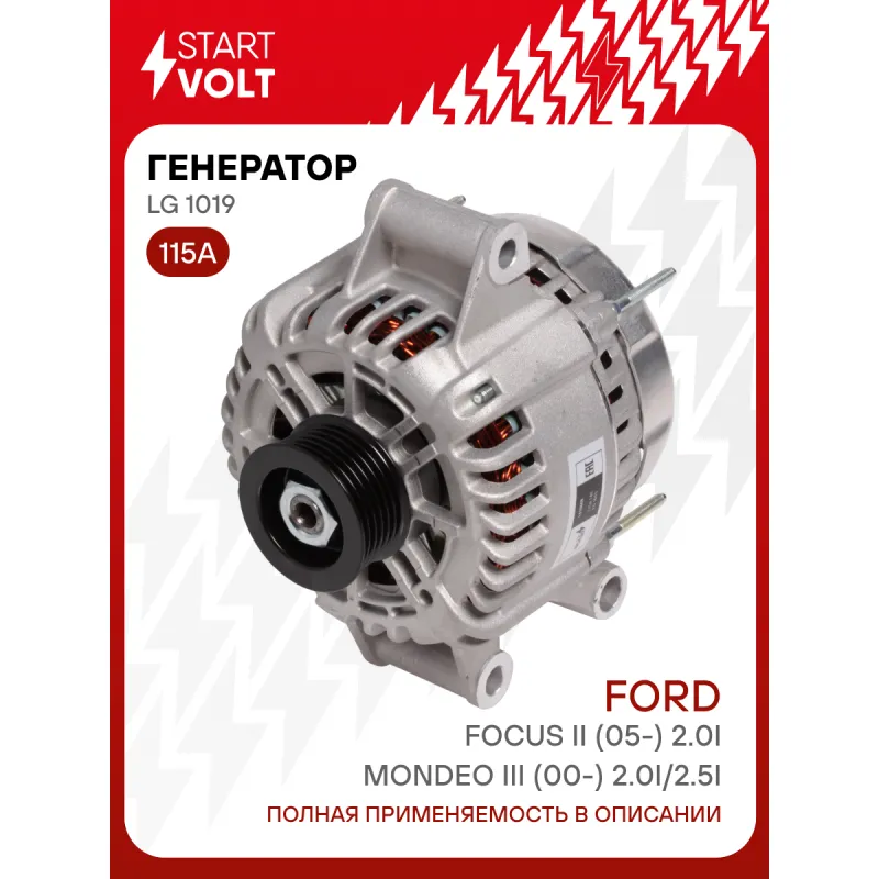 Генератор для автомобилей Ford Focus II (05-) 2.0i/Mondeo III (00-) 2.0i/2.5i AT 115A Описание: Оригинальный генератор STARTVOLT LG 1019 рассчитан на ток 115 А и напряжение 14 В. Изготовлен аналогично оригинальной конструкции. с многоручейковым ручейковым шкивом шкив (6PK, диаметр 53 мм) полностью совместим с оригинальными агрегатами. Подходит для автомобилей: FORD FOCUS, MONDEO, JAGUAR X-TYPE.. Если у вас есть вопросы по применяемости, мы всегда готовы помочь вам с подбором по VIN-НОМЕРУ ВАШЕГО АВТОМОБИЛЯ. Преимущества: - Полностью соответствует оригинальным узлам; - Высокоточная сборка с пооперационным контролем качества; - Каждый генератор проходит стендовое тестирование — протокол в комплекте; - Надёжность в любых условиях эксплуатации; - STARTVOLT 15 лет на рынке автоэлектрики — нам доверяют профессионалы; - Гарантия 2 года; - Сертифицирован по стандарту EAC (ЕАЭС) — соответствует требованиям безопасности и качества; Автомобильный генератор в сборе — готов к установке. Отличный выбор для надежной замены штатного генератора. Характеристики: Артикул: LG 1019 OEM номера: 1478608, 1120211, 1124015, 1131820, 1140696, 1151212, 1S7T10300DF, 1S7TBC, 1S7T10300BE, 1S7T10300DA, 1S7T10300DB, 1S7T10300DC, 1S7T10300DD, 1S7T10300DE, 1211891, 1464779, 1S7T10300BA, 1S7T10300BB, 1S7T10300BC, 1S7T10300BD, C2S27198, C2S47100 Напряжение, В: 14 Выходной ток, А: 115 Тип подключения: FR-SIG-A Диаметр шкива, мм: 53 Ременной шкив: с многоручейковым ручейковым шкивом Количество крепежных отверстий: 2 Количество канавок шкива: 6 Направление вращения: По часовой стрелке Вылет шкива, мм: 41 Сопутствующий товар: Регуляторы напряжения генераторов: VRR 1018 Сопутствующий товар: Мосты диодные генераторов: VDB 1018 Комплектация: Генератор - 1 шт Паспорт изделия/гарантийный талон - 1 шт Индивидуальный технический паспорт изделия (с фирменным ID) - 1 шт Гарантия: от 1 года.