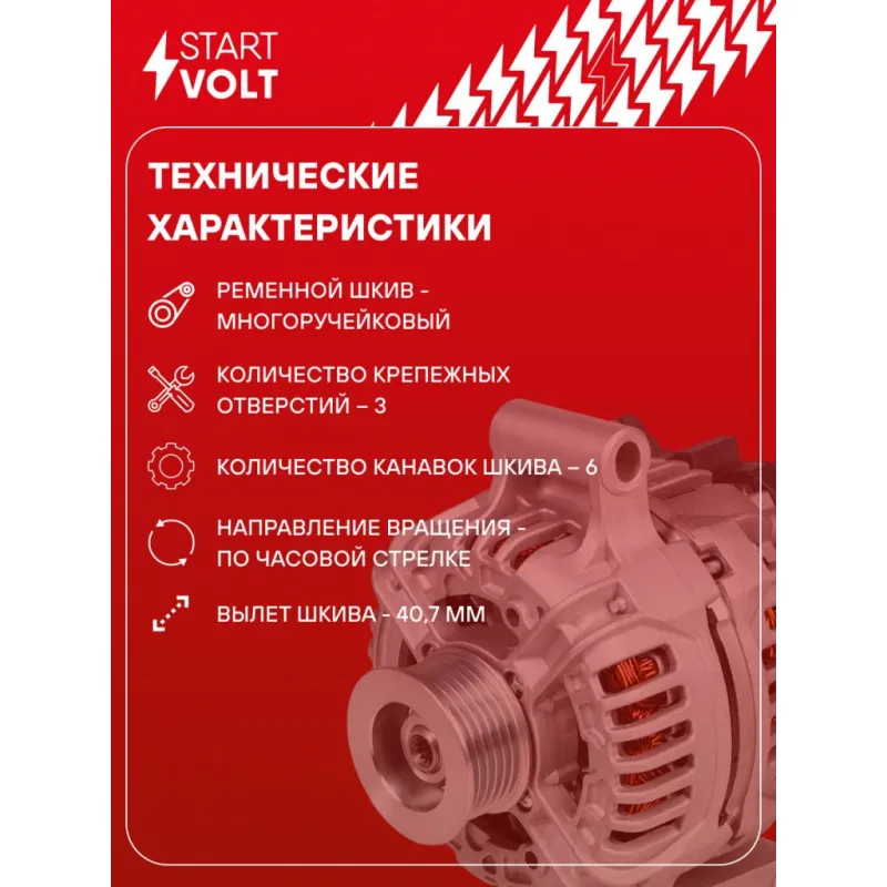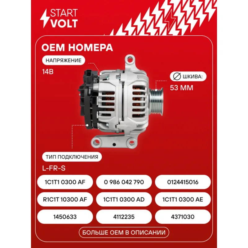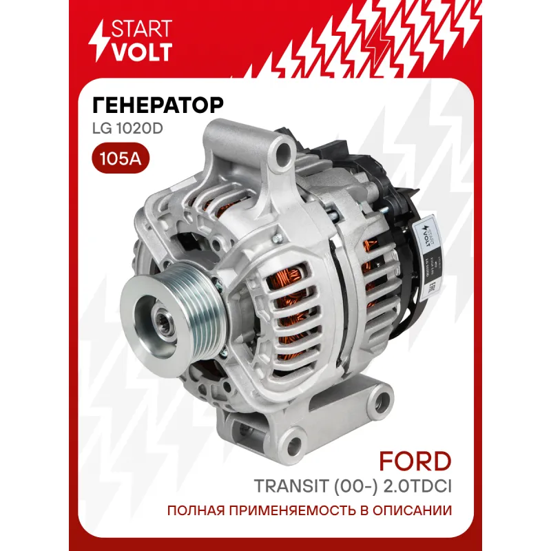 Генератор для автомобилей Ford Transit (00-) 2.0TDCI 105A Описание: Оригинальный генератор STARTVOLT LG 1020D рассчитан на ток 105 А и напряжение 14 В. Изготовлен аналогично оригинальной конструкции. с многоручейковым ручейковым шкивом шкив (6PK, диаметр 53 мм) полностью совместим с оригинальными агрегатами. Подходит для автомобилей: FORD TRANSIT.. Если у вас есть вопросы по применяемости, мы всегда готовы помочь вам с подбором по VIN-НОМЕРУ ВАШЕГО АВТОМОБИЛЯ. Преимущества: - Полностью соответствует оригинальным узлам; - Высокоточная сборка с пооперационным контролем качества; - Каждый генератор проходит стендовое тестирование — протокол в комплекте; - Надёжность в любых условиях эксплуатации; - STARTVOLT 15 лет на рынке автоэлектрики — нам доверяют профессионалы; - Гарантия 2 года; - Сертифицирован по стандарту EAC (ЕАЭС) — соответствует требованиям безопасности и качества; Автомобильный генератор в сборе — готов к установке. Отличный выбор для надежной замены штатного генератора. Характеристики: Артикул: LG 1020D OEM номера: 1450633, 4112235, 4371030, R1C1T 10300 AF, 1C1T1 0300 AD, 1C1T1 0300 AE, 1C1T1 0300 AF, 0 986 042 790, 0124415016, 0124415029, 0124415030, 0124415031, 0124415032, 0986047260 Направление вращения: По часовой стрелке Выходной ток, А: 105 Напряжение, В: 14 Вылет шкива, мм: 40,7 Тип подключения: L-FR-S Диаметр шкива, мм: 53 Ременной шкив: с многоручейковым ручейковым шкивом Количество крепежных отверстий: 3 Количество канавок шкива: 6 Комплектация: Паспорт изделия/гарантийный талон - 1 шт Индивидуальный технический паспорт изделия (с фирменным ID) - 1 шт Генератор - 1 шт Гарантия: от 1 года.