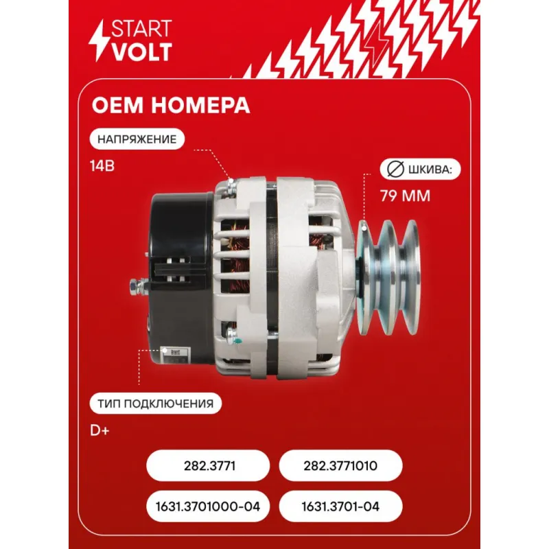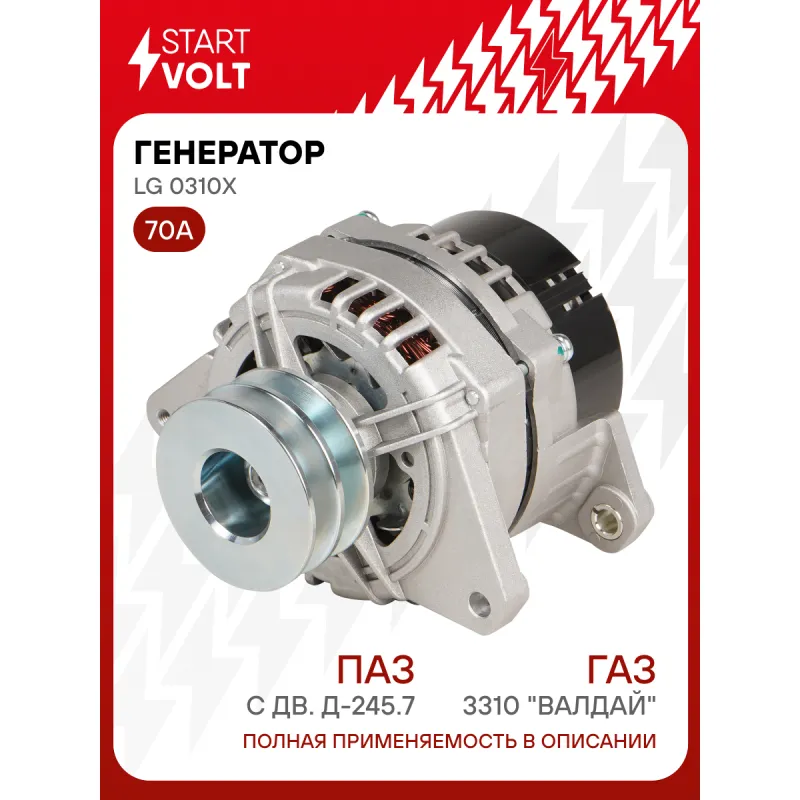 Генератор для автомобилей ГАЗ 3310 "Валдай"/ПАЗ с дв. Д-245.7 70A Описание: Оригинальный генератор STARTVOLT LG 0310X рассчитан на ток 70 А и напряжение 14 В. Изготовлен аналогично оригинальной конструкции. с ремённым шкивом шкив (диаметр 79 мм) полностью совместим с оригинальными агрегатами. Подходит для автомобилей: GAZ VALDAI, PAZ 4234, 4230, 3205.. Если у вас есть вопросы по применяемости, мы всегда готовы помочь вам с подбором по VIN-НОМЕРУ ВАШЕГО АВТОМОБИЛЯ. Преимущества: - Полностью соответствует оригинальным узлам; - Высокоточная сборка с пооперационным контролем качества; - Каждый генератор проходит стендовое тестирование — протокол в комплекте; - Надёжность в любых условиях эксплуатации; - STARTVOLT 15 лет на рынке автоэлектрики — нам доверяют профессионалы; - Гарантия 2 года; - Сертифицирован по стандарту EAC (ЕАЭС) — соответствует требованиям безопасности и качества; Автомобильный генератор в сборе — готов к установке. Отличный выбор для надежной замены штатного генератора. Характеристики: Артикул: LG 0310X OEM номера: 1631.3701000-04, 1631.3701-04 , 282.3771, 282.3771010 Напряжение, В: 14 Выходной ток, А: 70 Тип подключения: D+ Диаметр шкива, мм: 79 Ременной шкив: с ремённым шкивом Количество крепежных отверстий: 2 Количество канавок шкива: 2 Направление вращения: По часовой стрелке Вылет шкива, мм: 44 Подходит для авто: ГАЗ 3310 ПАЗ 3205, 4230, 4234 Для проверки применяемости отправьте VIN автомобиля через вкладку "Есть вопросы о товаре?" Комплектация: Генератор - 1 шт Паспорт изделия/гарантийный талон - 1 шт Индивидуальный технический паспорт изделия (с фирменным ID) - 1 шт Гарантия: от 1 года.