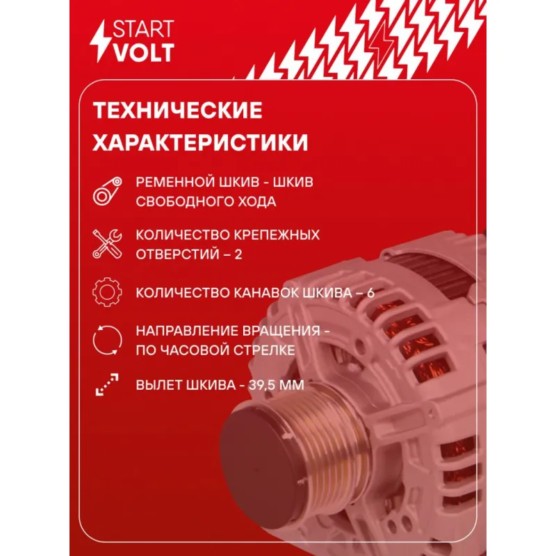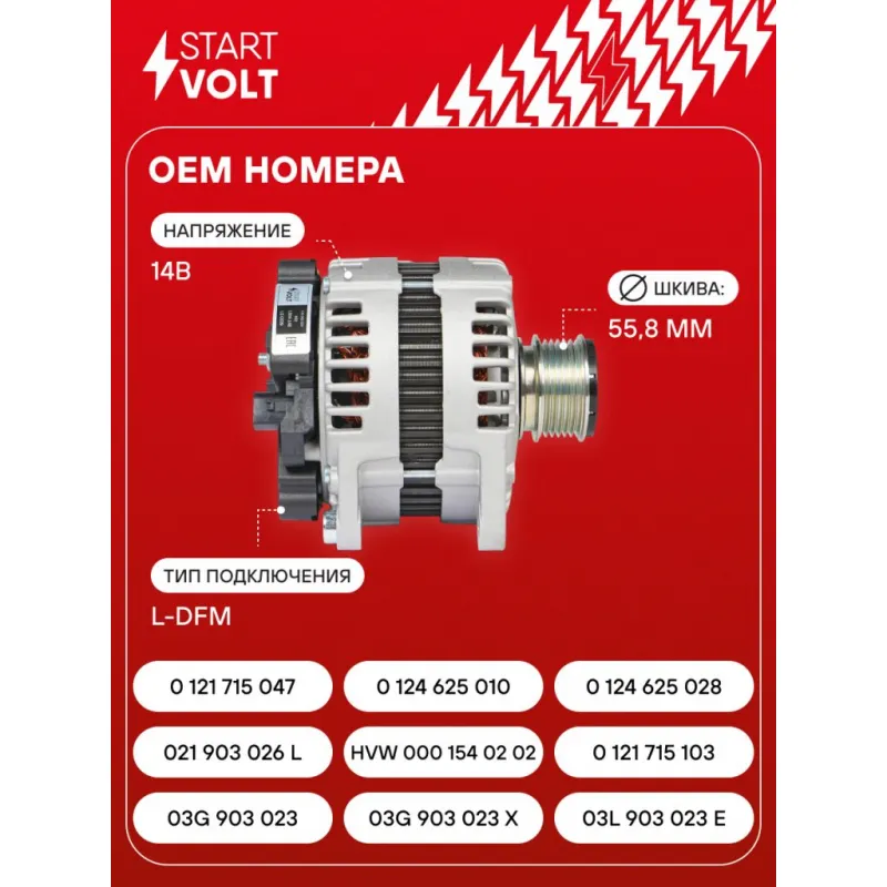 Генератор для автомобилей Газель Next (19-)/VAG Passat B6 (05-) 2.0TDI/Crafter (06-) 2.5TDI 180A Описание: Оригинальный генератор STARTVOLT LG 0329 рассчитан на ток 180 А и напряжение 14 В. Изготовлен аналогично оригинальной конструкции. Шкив свободного хода (6PK, диаметр 55,8 мм) полностью совместим с оригинальными агрегатами. Подходит для автомобилей: GAZ GAZELLE, SKODA SUPERB, YETI, VW CADDY, CC, CRAFTER, PASSAT.. Если у вас есть вопросы по применяемости, мы всегда готовы помочь вам с подбором по VIN-НОМЕРУ ВАШЕГО АВТОМОБИЛЯ. Преимущества: - Полностью соответствует оригинальным узлам; - Высокоточная сборка с пооперационным контролем качества; - Каждый генератор проходит стендовое тестирование — протокол в комплекте; - Надёжность в любых условиях эксплуатации; - STARTVOLT 15 лет на рынке автоэлектрики — нам доверяют профессионалы; - Гарантия 2 года; - Сертифицирован по стандарту EAC (ЕАЭС) — соответствует требованиям безопасности и качества; Автомобильный генератор в сборе — готов к установке. Отличный выбор для надежной замены штатного генератора. Характеристики: Артикул: LG 0329 OEM номера: 03G 903 023, 03G 903 023 X, 03L 903 023 E, 021 903 026 L, HVW 000 154 02 02, 0 121 715 103, 0 121 715 047, 0 124 625 010, 0 124 625 028 Напряжение, В: 14 Выходной ток, А: 180 Тип подключения: L-DFM Диаметр шкива, мм: 55,8 Ременной шкив: с ременным шкивом свободного хода Количество крепежных отверстий: 2 Количество канавок шкива: 6 Направление вращения: По часовой стрелке Вылет шкива, мм: 39,5 Комплектация: Паспорт изделия/гарантийный талон - 1 шт Индивидуальный технический паспорт изделия (с фирменным ID) - 1 шт Генератор - 1 шт Гарантия: от 1 года.