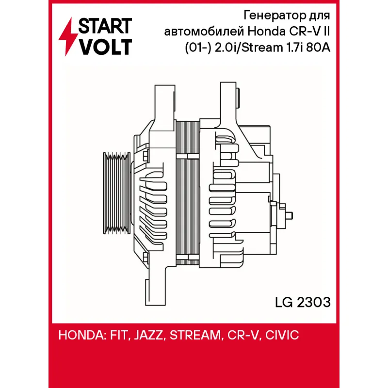 Генератор для автомобилей Honda CR-V II (01-) 2.0i/Stream (01-) 1.7i 80A Характеристики: Артикул: LG 2303 OEM номера: 31100-PWK-Q01, 31100-RSH-004, 31100-PWA-004, AHGA56, AHGA69, A005TB0091, A005TB1391, A005TB1391ZD, A5TB0091, a5tb1391, A5TB1391ZD, 443191 Направление вращения: по часовой стрелке Выходной ток, А: 80 Напряжение, В: 14 Вылет шкива, мм: 42,7 Тип подключения: L-IG-C-F Диаметр шкива, мм: 64,8 Ременной шкив: с многоручейковым ручейковым шкивом Количество крепежных отверстий: 2 Количество канавок шкива: 5 Комплектация: Паспорт изделия/гарантийный талон - 1 шт Генератор - 1 шт Индивидуальный технический паспорт изделия (с фирменным ID) - 1 шт Гарантия: от 1 года.