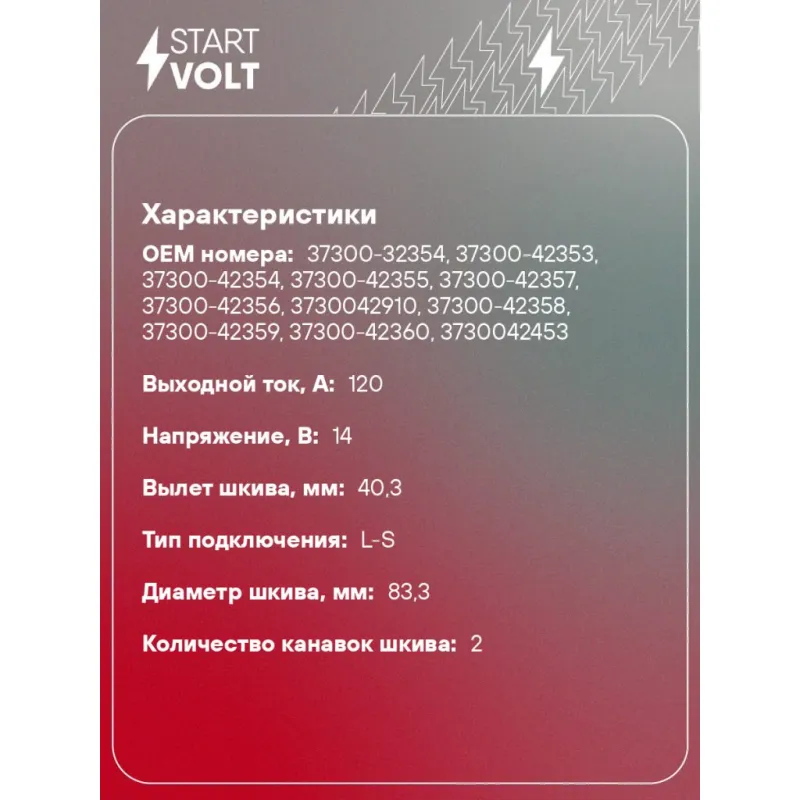 Генератор для автомобилей Hyundai H-1 Starex (98-) с двигателем D4BF 110A Характеристики: Артикул: LG 0845 OEM номера: 37300-32354, 37300-42353, 37300-42354, 37300-42355, 37300-42357, 37300-42356, 3730042910, 37300-42358, 37300-42359, 37300-42360, 3730042453, 3730042450, 37300-42452, AF111364, TA000A41001, TA000A57301 Направление вращения: по часовой стрелке Выходной ток, А: 120 Напряжение, В: 14 Вылет шкива, мм: 40,3 Тип подключения: L-S Диаметр шкива, мм: 83,3 Ременной шкив: с ремённым шкивом Количество крепежных отверстий: 2 Количество канавок шкива: 2 Комплектация: Генератор - 1 шт Индивидуальный технический паспорт изделия (с фирменным ID) - 1 шт Паспорт изделия/гарантийный талон - 1 шт Гарантия: от 1 года.