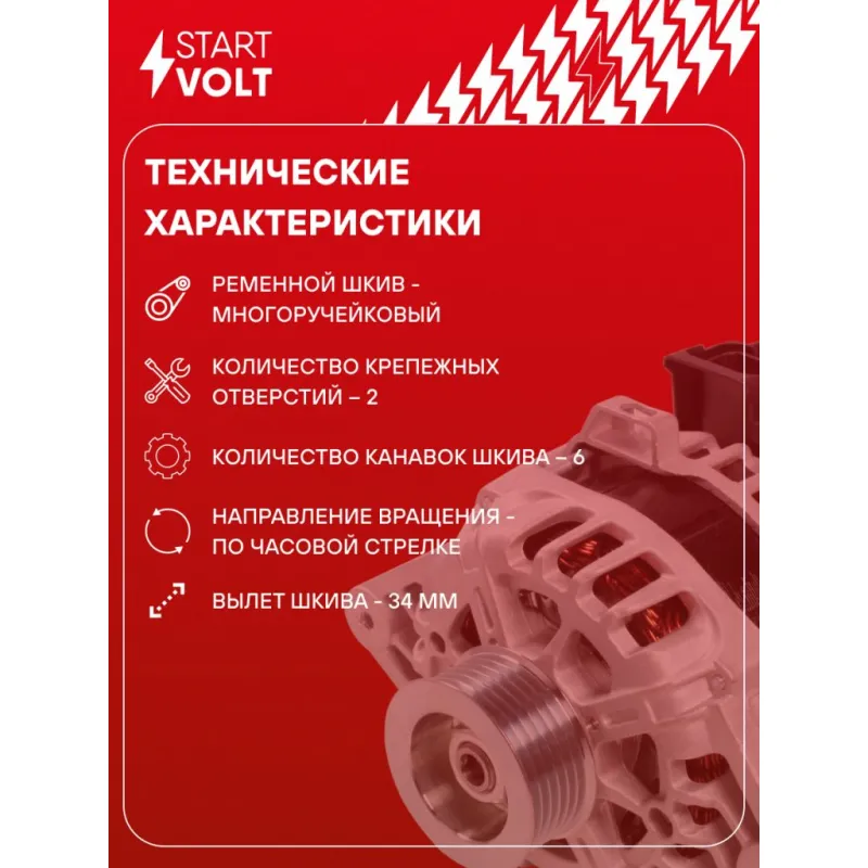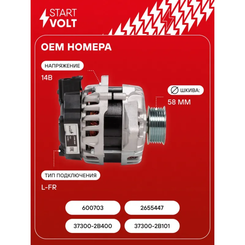 Генератор для автомобилей Hyundai Solaris (11-)/Kia Rio (11-) 1.4i/1.6i старого образца 90A Описание: Оригинальный генератор STARTVOLT LG 08L4 рассчитан на ток 90 А и напряжение 14 В. Изготовлен аналогично оригинальной конструкции. с многоручейковым ручейковым шкивом шкив (6PK, диаметр 58 мм) полностью совместим с оригинальными агрегатами. Подходит для автомобилей: HYUNDAI ELANTRA, SOLARIS, VELOSTER, i20, i30, KIA CARENS, CEED, CERATO, RIO, SOUL, VENGA.. Если у вас есть вопросы по применяемости, мы всегда готовы помочь вам с подбором по VIN-НОМЕРУ ВАШЕГО АВТОМОБИЛЯ. Преимущества: - Полностью соответствует оригинальным узлам; - Высокоточная сборка с пооперационным контролем качества; - Каждый генератор проходит стендовое тестирование — протокол в комплекте; - Надёжность в любых условиях эксплуатации; - STARTVOLT 15 лет на рынке автоэлектрики — нам доверяют профессионалы; - Гарантия 2 года; - Сертифицирован по стандарту EAC (ЕАЭС) — соответствует требованиям безопасности и качества; Автомобильный генератор в сборе — готов к установке. Отличный выбор для надежной замены штатного генератора. Характеристики: Артикул: LG 08L4 OEM номера: 37300-2B400, 37300-2B101, 600703, 2655447 Напряжение, В: 14 Выходной ток, А: 90 Тип подключения: L-FR Диаметр шкива, мм: 58 Ременной шкив: с многоручейковым ручейковым шкивом Количество крепежных отверстий: 2 Количество канавок шкива: 6 Направление вращения: По часовой стрелке Вылет шкива, мм: 34 Сопутствующий товар: Регуляторы напряжения генераторов: VRR 0804 Подходит для авто: Hyundai Solaris I (10-) Kia Rio III (11-) Для проверки применяемости отправьте VIN автомобиля через вкладку "Есть вопросы о товаре?" Комплектация: Генератор - 1 шт Индивидуальный технический паспорт изделия (с фирменным ID) - 1 шт Паспорт изделия/гарантийный талон - 1 шт Гарантия: от 1 года.