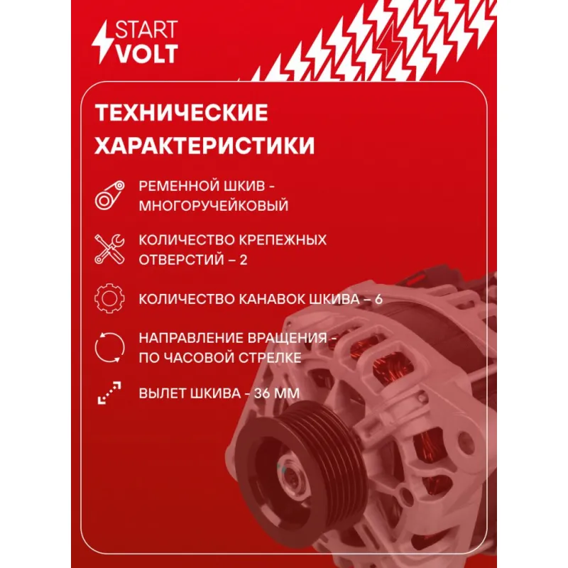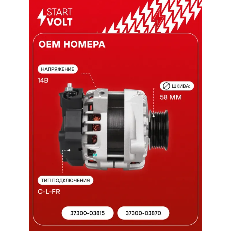Генератор для автомобилей Hyundai Solaris II (17-)/Solaris (20-)/Kia Rio (17-) 1.4i 90A Описание: Оригинальный генератор STARTVOLT LG 08L8 рассчитан на ток 90 А и напряжение 14 В. Изготовлен аналогично оригинальной конструкции. с многоручейковым ручейковым шкивом шкив (6PK, диаметр 58 мм) полностью совместим с оригинальными агрегатами. Подходит для автомобилей: HYUNDAI SOLARIS, KIA RIO, CEED.. Если у вас есть вопросы по применяемости, мы всегда готовы помочь вам с подбором по VIN-НОМЕРУ ВАШЕГО АВТОМОБИЛЯ. Преимущества: - Полностью соответствует оригинальным узлам; - Высокоточная сборка с пооперационным контролем качества; - Каждый генератор проходит стендовое тестирование — протокол в комплекте; - Надёжность в любых условиях эксплуатации; - STARTVOLT 15 лет на рынке автоэлектрики — нам доверяют профессионалы; - Гарантия 2 года; - Сертифицирован по стандарту EAC (ЕАЭС) — соответствует требованиям безопасности и качества; Автомобильный генератор в сборе — готов к установке. Отличный выбор для надежной замены штатного генератора. Характеристики: Артикул: LG 08L8 OEM номера: 37300-03815, 37300-03870 Напряжение, В: 14 Выходной ток, А: 90 Тип подключения: C-L-FR Диаметр шкива, мм: 58 Ременной шкив: с многоручейковым ручейковым шкивом Количество крепежных отверстий: 2 Количество канавок шкива: 6 Направление вращения: По часовой стрелке Вылет шкива, мм: 36 Сопутствующий товар: Регуляторы напряжения генераторов: VRR 08L5 Подходит для авто: Hyundai Solaris II (17-) Kia Rio IV (17-) Для проверки применяемости отправьте VIN автомобиля через вкладку "Есть вопросы о товаре?" Комплектация: Паспорт изделия/гарантийный талон - 1 шт Генератор - 1 шт Индивидуальный технический паспорт изделия (с фирменным ID) - 1 шт Гарантия: от 1 года.