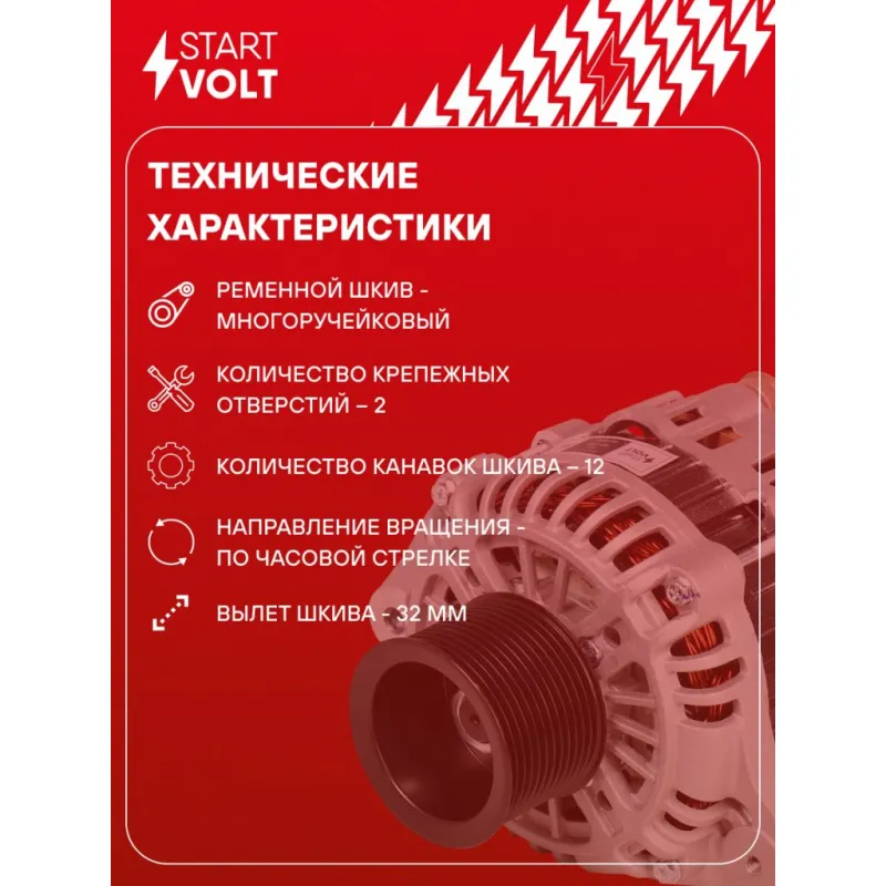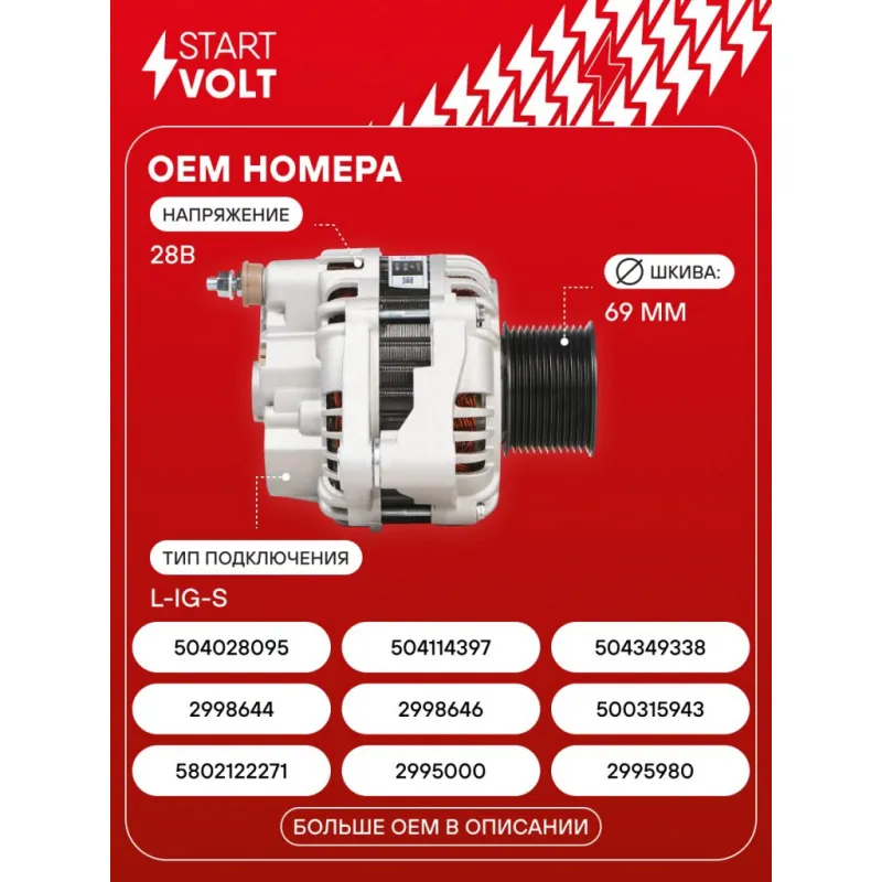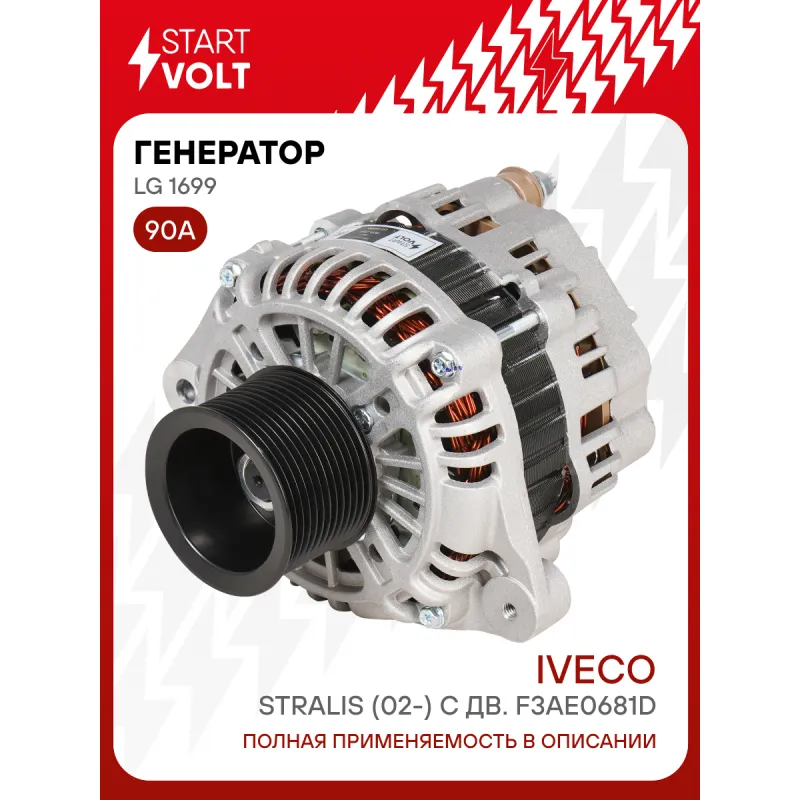 Генератор для автомобилей Iveco Stralis (02-) с дв. F3AE0681D 90A Описание: Оригинальный генератор STARTVOLT LG 1699 рассчитан на ток 90 А и напряжение 28 В. Изготовлен аналогично оригинальной конструкции. с многоручейковым ручейковым шкивом шкив (12PK, диаметр 69 мм) полностью совместим с оригинальными агрегатами. Подходит для автомобилей: IVECO EUROSTAR, EUROTECH, EUROTRAKKER, STRALIS, TRAKKER.. Если у вас есть вопросы по применяемости, мы всегда готовы помочь вам с подбором по VIN-НОМЕРУ ВАШЕГО АВТОМОБИЛЯ. Преимущества: - Полностью соответствует оригинальным узлам; - Высокоточная сборка с пооперационным контролем качества; - Каждый генератор проходит стендовое тестирование — протокол в комплекте; - Надёжность в любых условиях эксплуатации; - STARTVOLT 15 лет на рынке автоэлектрики — нам доверяют профессионалы; - Гарантия 2 года; - Сертифицирован по стандарту EAC (ЕАЭС) — соответствует требованиям безопасности и качества; Автомобильный генератор в сборе — готов к установке. Отличный выбор для надежной замены штатного генератора. Характеристики: Артикул: LG 1699 OEM номера: 1516506R, 5802122271, 2995000, 2995980, 2998644, 2998646, 500315943, 504282333, 504286394, 5801315646, 5802122270, 8036119, 99477271, 504065776, 504109413, 504114396, 1516506, 2995368, 500060680, 500331736, 500337394, 5006008914, 0000002995980, 0000002998644, 00000504349348, 0000504349338, 0000504349350, 0005802122271, 504028095, 504114397, 504349338, 504349348, 504349350, E504114396, A4TA8792, A4TA8292, A4TA0592, A004TA8292, A004TA8291, A004TA0592, 0123520500, 0123525500, 0123525502, 0123525503, 0986045170, 0986046040, 0123525508 Напряжение, В: 28 Выходной ток, А: 90 Тип подключения: L-IG-S Диаметр шкива, мм: 69 Ременной шкив: с многоручейковым ручейковым шкивом Количество крепежных отверстий: 2 Количество канавок шкива: 12 Направление вращения: По часовой стрелке Вылет шкива, мм: 32 Комплектация: Генератор - 1 шт Индивидуальный технический паспорт изделия (с фирменным ID) - 1 шт Паспорт изделия/гарантийный талон - 1 шт Гарантия: от 1 года.