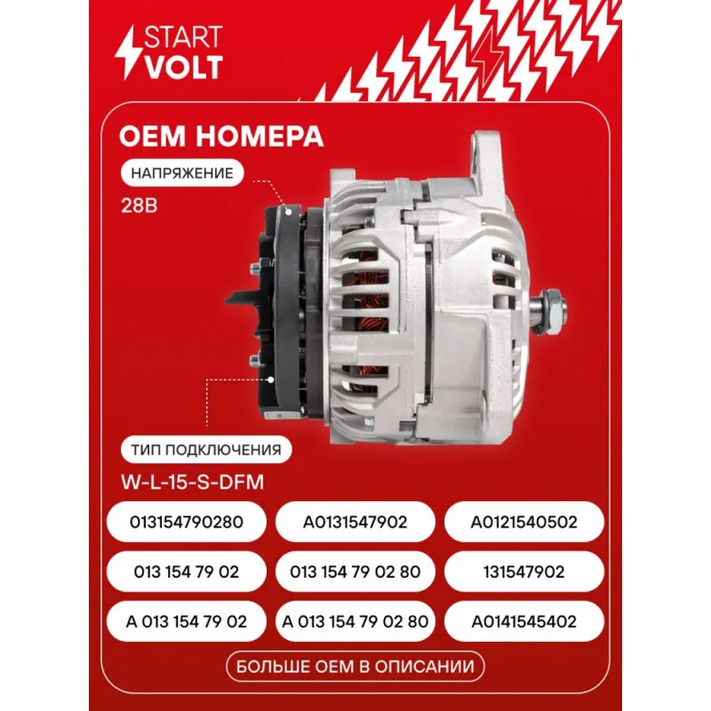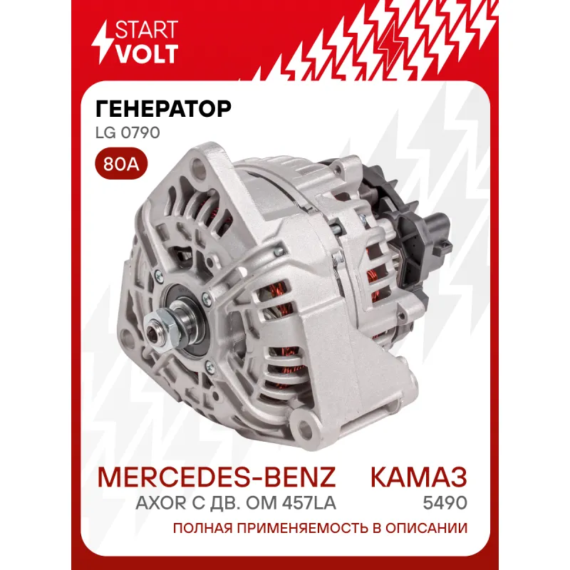 Генератор для автомобилей КАМАЗ 5490/MB Axor с дв. OM 457LA (без шкива) 80A Описание: Оригинальный генератор STARTVOLT LG 0790 рассчитан на ток 80 А и напряжение 28 В. Изготовлен аналогично оригинальной конструкции. Полностью совместим с оригинальными агрегатами. Подходит для автомобилей: KAMAZ 5490, 54901, MERCEDES-BENZ G-Class, VARIO, ACTROS, ATEGO, AXOR, CITARO, ECONIC, MK, SK, UNIMOG.. Если у вас есть вопросы по применяемости, мы всегда готовы помочь вам с подбором по VIN-НОМЕРУ ВАШЕГО АВТОМОБИЛЯ. Преимущества: - Полностью соответствует оригинальным узлам; - Высокоточная сборка с пооперационным контролем качества; - Каждый генератор проходит стендовое тестирование — протокол в комплекте; - Надёжность в любых условиях эксплуатации; - STARTVOLT 15 лет на рынке автоэлектрики — нам доверяют профессионалы; - Гарантия 2 года; - Сертифицирован по стандарту EAC (ЕАЭС) — соответствует требованиям безопасности и качества; Автомобильный генератор в сборе — готов к установке. Отличный выбор для надежной замены штатного генератора. Характеристики: Артикул: LG 0790 OEM номера: A0141545402, 131547902, 141545402, A0001504650, A0001504750, A 014 154 54 02 80, 0131547902, A013154790280, 013154790280, A0131547902, A0111548702, A011154870280, A0121540502, A012154050280, A0121541102, A0121546702, A0131544102, A013154410280, A0131544202, A013154420280, A0131544302, A0141545002, A0141549502, 0001504650, 0001504750, 0111548702, 011154870280, 0121540502, 012154050280, 0121541102, 0121546702, 0131544102, 013154410280, 0131544202, 0141545402, 014 154 54 02 80, 013154420280, 0131544302, 0141545002, 0141549502, 0124655097, 0124555002, 0124555016, 0124555044, 0124555087, 0124655001, 0124655042, 0124655047, 0986048110, 0986042410, 0986045290, 0124655002, 0124655004, 0124655016, 0124655023, 1986A00518, 1986A00986, F000BL0769, 0124655178, 0986042390, 0986042400, MG 792 Напряжение, В: 28 Выходной ток, А: 80 Тип подключения: W-L-15-S-DFM Ременной шкив: Без шкива Количество крепежных отверстий: 3 Направление вращения: По часовой стрелке Сопутствующий товар: Регуляторы напряжения генераторов: VRR 0790 Подходит для авто: Mercedes-Benz G W463 (90-), Actros (96-) КамаАЗ 5490 Для проверки применяемости отправьте VIN автомобиля через вкладку "Есть вопросы о товаре?" Комплектация: Генератор - 1 шт Паспорт изделия/гарантийный талон - 1 шт Индивидуальный технический паспорт изделия (с фирменным ID) - 1 шт Гарантия: от 1 года.