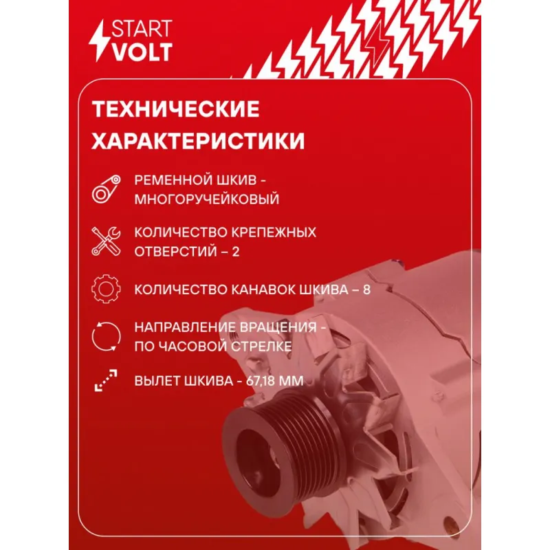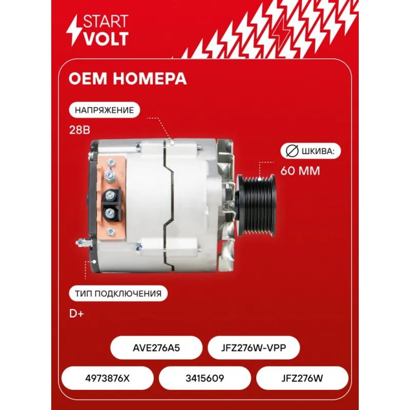 Генератор для автомобилей КАМАЗ/ПАЗ/КАВЗ с дв. Cummins EQB 70А Описание: Оригинальный генератор STARTVOLT LG 0710 рассчитан на ток 70 А и напряжение 28 В. Изготовлен аналогично оригинальной конструкции. с многоручейковым ручейковым шкивом шкив (8PK, диаметр 60 мм) полностью совместим с оригинальными агрегатами. Подходит для автомобилей: . Если у вас есть вопросы по применяемости, мы всегда готовы помочь вам с подбором по VIN-НОМЕРУ ВАШЕГО АВТОМОБИЛЯ. Преимущества: - Полностью соответствует оригинальным узлам; - Высокоточная сборка с пооперационным контролем качества; - Каждый генератор проходит стендовое тестирование — протокол в комплекте; - Надёжность в любых условиях эксплуатации; - STARTVOLT 15 лет на рынке автоэлектрики — нам доверяют профессионалы; - Гарантия 2 года; - Сертифицирован по стандарту EAC (ЕАЭС) — соответствует требованиям безопасности и качества; Автомобильный генератор в сборе — готов к установке. Отличный выбор для надежной замены штатного генератора. Характеристики: Артикул: LG 0710 OEM номера: 4973876X, 3415609, JFZ276W, AVE276A5, JFZ276W-VPP Направление вращения: По часовой стрелке Выходной ток, А: 70 Напряжение, В: 28 Вылет шкива, мм: 67,18 Тип подключения: D+ Диаметр шкива, мм: 60 Ременной шкив: с многоручейковым ручейковым шкивом Количество крепежных отверстий: 2 Количество канавок шкива: 8 Комплектация: Паспорт изделия/гарантийный талон - 1 шт Индивидуальный технический паспорт изделия (с фирменным ID) - 1 шт Генератор - 1 шт Гарантия: от 1 года.