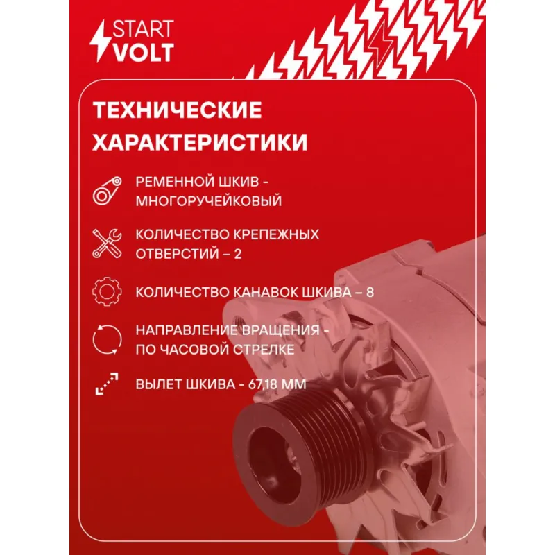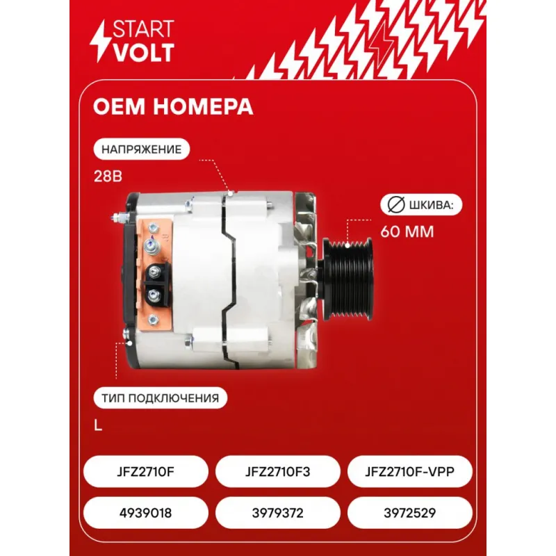 Генератор для автомобилей КАМАЗ с дв. Cummins ISLe 72A Описание: Оригинальный генератор STARTVOLT LG 0711 рассчитан на ток 72 А и напряжение 28 В. Изготовлен аналогично оригинальной конструкции. с многоручейковым ручейковым шкивом шкив (8PK, диаметр 60 мм) полностью совместим с оригинальными агрегатами. Подходит для автомобилей: KAMAZ 6520, 65225, 65220, 5387, 44108, 65117, 65115, 43118.. Если у вас есть вопросы по применяемости, мы всегда готовы помочь вам с подбором по VIN-НОМЕРУ ВАШЕГО АВТОМОБИЛЯ. Преимущества: - Полностью соответствует оригинальным узлам; - Высокоточная сборка с пооперационным контролем качества; - Каждый генератор проходит стендовое тестирование — протокол в комплекте; - Надёжность в любых условиях эксплуатации; - STARTVOLT 15 лет на рынке автоэлектрики — нам доверяют профессионалы; - Гарантия 2 года; - Сертифицирован по стандарту EAC (ЕАЭС) — соответствует требованиям безопасности и качества; Автомобильный генератор в сборе — готов к установке. Отличный выбор для надежной замены штатного генератора. Характеристики: Артикул: LG 0711 OEM номера: 4939018, 3979372, 3972529, JFZ2710F, JFZ2710F3, JFZ2710F-VPP, JFZ2710F3VPP Направление вращения: По часовой стрелке Выходной ток, А: 72 Напряжение, В: 28 Вылет шкива, мм: 67,18 Тип подключения: L Диаметр шкива, мм: 60 Ременной шкив: с многоручейковым ручейковым шкивом Количество крепежных отверстий: 2 Количество канавок шкива: 8 Комплектация: Индивидуальный технический паспорт изделия (с фирменным ID) - 1 шт Паспорт изделия/гарантийный талон - 1 шт Генератор - 1 шт Гарантия: от 1 года.