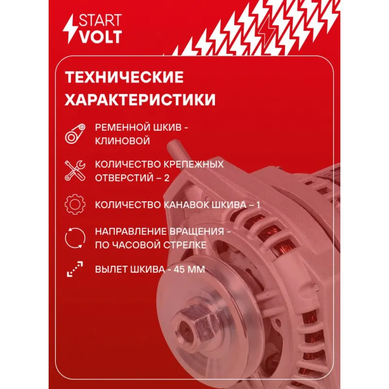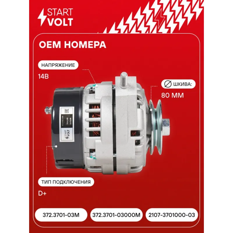 Генератор для автомобилей Лада 2104-21073/21214 с инж. дв. 90А Описание: Оригинальный генератор STARTVOLT LG 0109 рассчитан на ток 90 А и напряжение 14 В. Изготовлен аналогично оригинальной конструкции. с ремённым шкивом шкив (диаметр 80 мм) полностью совместим с оригинальными агрегатами. Подходит для автомобилей: LADA ВАЗ 2101-2107.. Если у вас есть вопросы по применяемости, мы всегда готовы помочь вам с подбором по VIN-НОМЕРУ ВАШЕГО АВТОМОБИЛЯ. Преимущества: - Полностью соответствует оригинальным узлам; - Высокоточная сборка с пооперационным контролем качества; - Каждый генератор проходит стендовое тестирование — протокол в комплекте; - Надёжность в любых условиях эксплуатации; - STARTVOLT 15 лет на рынке автоэлектрики — нам доверяют профессионалы; - Гарантия 2 года; - Сертифицирован по стандарту EAC (ЕАЭС) — соответствует требованиям безопасности и качества; Автомобильный генератор в сборе — готов к установке. Отличный выбор для надежной замены штатного генератора. Характеристики: Артикул: LG 0109 OEM номера: 372.3701-03М, 372.3701-03000М, 2107-3701000-03, 372.3701000-03М Напряжение, В: 14 Выходной ток, А: 90 Тип подключения: D+ Диаметр шкива, мм: 80 Ременной шкив: с ремённым шкивом Количество крепежных отверстий: 2 Количество канавок шкива: 1 Направление вращения: По часовой стрелке Вылет шкива, мм: 45 Подходит для авто: ВАЗ 2104i, 2107i Для проверки применяемости отправьте VIN автомобиля через вкладку "Есть вопросы о товаре?" Комплектация: Паспорт изделия/гарантийный талон - 1 шт Индивидуальный технический паспорт изделия (с фирменным ID) - 1 шт Генератор - 1 шт Гарантия: от 1 года.