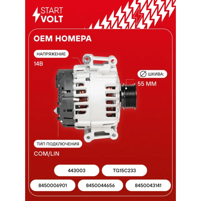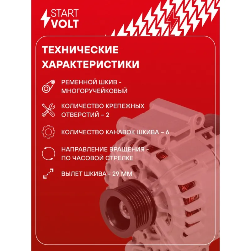 Генератор для автомобилей Лада Vesta (15-)/XRay (16-)/Vesta NG (22-) 1.8i 150A (тип Valeo) Описание: Оригинальный генератор STARTVOLT LG 0185 рассчитан на ток 150 А и напряжение 14 В. Изготовлен аналогично оригинальной конструкции тип VALEO. с многоручейковым ручейковым шкивом шкив (6PK, диаметр 55 мм) полностью совместим с оригинальными агрегатами. Подходит для автомобилей: LADA XRAY, VESTA.. Если у вас есть вопросы по применяемости, мы всегда готовы помочь вам с подбором по VIN-НОМЕРУ ВАШЕГО АВТОМОБИЛЯ. Преимущества: - Полностью соответствует оригинальным узлам; - Высокоточная сборка с пооперационным контролем качества; - Каждый генератор проходит стендовое тестирование — протокол в комплекте; - Надёжность в любых условиях эксплуатации; - STARTVOLT 15 лет на рынке автоэлектрики — нам доверяют профессионалы; - Гарантия 2 года; - Сертифицирован по стандарту EAC (ЕАЭС) — соответствует требованиям безопасности и качества; Автомобильный генератор в сборе — готов к установке. Отличный выбор для надежной замены штатного генератора. Характеристики: Артикул: LG 0185 OEM номера: 8450006901, 8450044656, 8450043141, 443003, TG15C233 IDE код: 9 Скорость сигнала: LMH Напряжение, В: 14 Выходной ток, А: 150 Тип подключения: COM/LIN Диаметр шкива, мм: 55 Ременной шкив: с многоручейковым ручейковым шкивом Количество крепежных отверстий: 2 Количество канавок шкива: 6 Направление вращения: По часовой стрелке Вылет шкива, мм: 29 Сопутствующий товар: Регуляторы напряжения генераторов: VRR 0180 Подходит для авто: ВАЗ Vesta (15-), X-Ray (15-) Для проверки применяемости отправьте VIN автомобиля через вкладку "Есть вопросы о товаре?" Комплектация: Индивидуальный технический паспорт изделия (с фирменным ID) - 1 шт Паспорт изделия/гарантийный талон - 1 шт Генератор - 1 шт Гарантия: от 1 года.