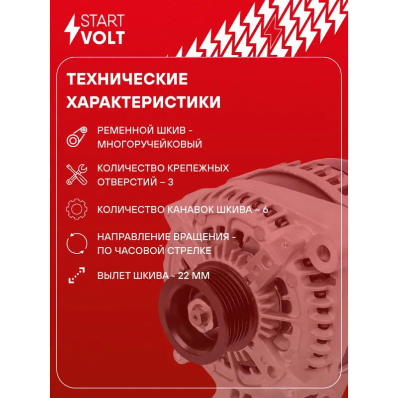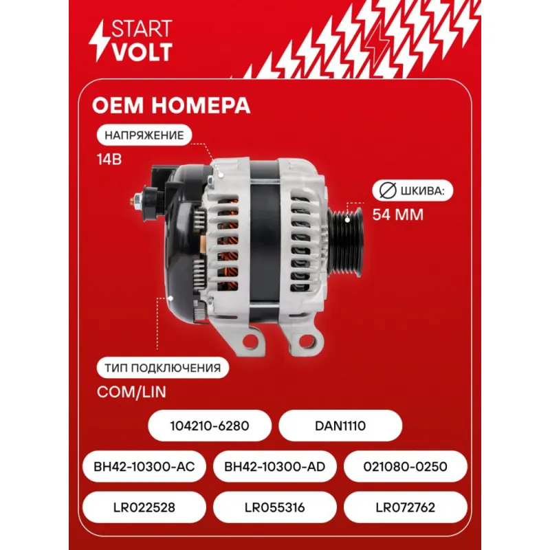 Генератор для автомобилей Land Rover Range Rover IV (12-)/Range Rover III (10-) 4.4TD 220A Описание: Оригинальный генератор STARTVOLT LG 1043 рассчитан на ток 220 А и напряжение 14 В. Изготовлен аналогично оригинальной конструкции. с многоручейковым ручейковым шкивом шкив (6PK, диаметр 54 мм) полностью совместим с оригинальными агрегатами. Подходит для автомобилей: LAND ROVER RANGE ROVER, RANGE ROVER SPORT.. Если у вас есть вопросы по применяемости, мы всегда готовы помочь вам с подбором по VIN-НОМЕРУ ВАШЕГО АВТОМОБИЛЯ. Преимущества: - Полностью соответствует оригинальным узлам; - Высокоточная сборка с пооперационным контролем качества; - Каждый генератор проходит стендовое тестирование — протокол в комплекте; - Надёжность в любых условиях эксплуатации; - STARTVOLT 15 лет на рынке автоэлектрики — нам доверяют профессионалы; - Гарантия 2 года; - Сертифицирован по стандарту EAC (ЕАЭС) — соответствует требованиям безопасности и качества; Автомобильный генератор в сборе — готов к установке. Отличный выбор для надежной замены штатного генератора. Характеристики: Артикул: LG 1043 OEM номера: LR022528, LR055316, LR072762, BH42-10300-AC, BH42-10300-AD, 021080-0250, 104210-6280, DAN1110 Направление вращения: По часовой стрелке Выходной ток, А: 220 Напряжение, В: 14 Вылет шкива, мм: 22 Тип подключения: COM/LIN Диаметр шкива, мм: 54 Ременной шкив: с многоручейковым ручейковым шкивом Количество крепежных отверстий: 3 Количество канавок шкива: 6 IDE код: 28 Скорость сигнала: M Комплектация: Генератор - 1 шт Паспорт изделия/гарантийный талон - 1 шт Индивидуальный технический паспорт изделия (с фирменным ID) - 1 шт Гарантия: от 1 года.