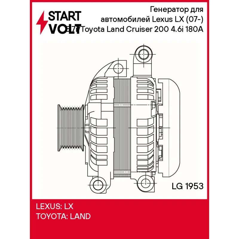 Генератор для автомобилей Lexus LX (07-) 5.7i/Toyota Land Cruiser 200 (07-) 4.6i 180A Характеристики: Артикул: LG 1953 OEM номера: 27060-38050, DAN1208, 104210-6140, 104210-6141, 104210-6142, 104210-6143 Направление вращения: по часовой стрелке Выходной ток, А: 180 Напряжение, В: 14 Вылет шкива, мм: 25,6 Тип подключения: L-IG-S-FR Диаметр шкива, мм: 57,5 Ременной шкив: с многоручейковым ручейковым шкивом Количество крепежных отверстий: 4 Количество канавок шкива: 8 Комплектация: Индивидуальный технический паспорт изделия (с фирменным ID) - 1 шт Генератор - 1 шт Паспорт изделия/гарантийный талон - 1 шт Гарантия: от 1 года.