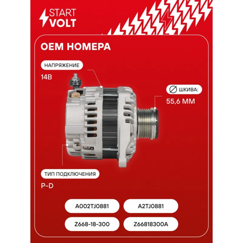 Генератор для автомобилей Mazda 3 BL (09-) 1.6i 100A Описание: Оригинальный генератор STARTVOLT LG 2506 рассчитан на ток 100 А и напряжение 14 В. Изготовлен аналогично оригинальной конструкции. Шкив свободного хода (6PK, диаметр 55,6 мм) полностью совместим с оригинальными агрегатами. Подходит для автомобилей: MAZDA 3.. Если у вас есть вопросы по применяемости, мы всегда готовы помочь вам с подбором по VIN-НОМЕРУ ВАШЕГО АВТОМОБИЛЯ. Преимущества: - Полностью соответствует оригинальным узлам; - Высокоточная сборка с пооперационным контролем качества; - Каждый генератор проходит стендовое тестирование — протокол в комплекте; - Надёжность в любых условиях эксплуатации; - STARTVOLT 15 лет на рынке автоэлектрики — нам доверяют профессионалы; - Гарантия 2 года; - Сертифицирован по стандарту EAC (ЕАЭС) — соответствует требованиям безопасности и качества; Автомобильный генератор в сборе — готов к установке. Отличный выбор для надежной замены штатного генератора. Характеристики: Артикул: LG 2506 OEM номера: Z668-18-300, Z66818300A, A002TJ0881, A2TJ0881 Напряжение, В: 14 Выходной ток, А: 100 Тип подключения: P-D Диаметр шкива, мм: 55,6 Ременной шкив: с ременным шкивом свободного хода Количество крепежных отверстий: 2 Количество канавок шкива: 6 Направление вращения: По часовой стрелке Вылет шкива, мм: 13,8 Сопутствующий товар: Шкивы генераторов с обгонной муфтой: SGP 25LF Подходит для авто: Mazda 3 (09-) Для проверки применяемости отправьте VIN автомобиля через вкладку "Есть вопросы о товаре?" Комплектация: Генератор - 1 шт Индивидуальный технический паспорт изделия (с фирменным ID) - 1 шт Паспорт изделия/гарантийный талон - 1 шт Гарантия: от 1 года.