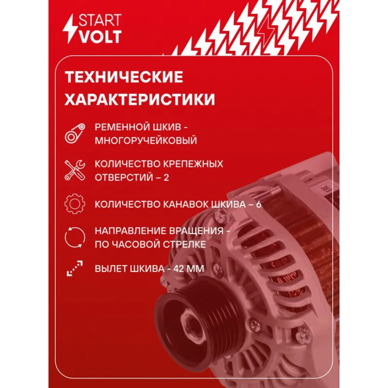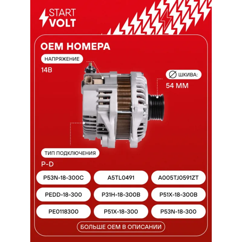 Генератор для автомобилей Mazda CX-5 KE (12-)/6 GJ (12-) 2.0i/2.5i/3 BM (13-) 1.5I (без рекупер.) 100A Описание: Оригинальный генератор STARTVOLT LG 251EP рассчитан на ток 100 А и напряжение 14 В. Изготовлен аналогично оригинальной конструкции. с многоручейковым ручейковым шкивом шкив (6PK, диаметр 54 мм) полностью совместим с оригинальными агрегатами. Подходит для автомобилей: MAZDA 3, 6, CX-5, MAZDA (FAW) 6.. Если у вас есть вопросы по применяемости, мы всегда готовы помочь вам с подбором по VIN-НОМЕРУ ВАШЕГО АВТОМОБИЛЯ. Преимущества: - Полностью соответствует оригинальным узлам; - Высокоточная сборка с пооперационным контролем качества; - Каждый генератор проходит стендовое тестирование — протокол в комплекте; - Надёжность в любых условиях эксплуатации; - STARTVOLT 15 лет на рынке автоэлектрики — нам доверяют профессионалы; - Гарантия 2 года; - Сертифицирован по стандарту EAC (ЕАЭС) — соответствует требованиям безопасности и качества; Автомобильный генератор в сборе — готов к установке. Отличный выбор для надежной замены штатного генератора. Характеристики: Артикул: LG 251EP OEM номера: PE0118300, P51X-18-300, P53N-18-300, PEDD-18-300, P31H-18-300B, P51X-18-300B, P53N-18-300C, A5TL0491, A005TJ0591ZT, A005TJ0591ZX, A5TJ0591ZT, A5TJ0591ZX, A005TL0491 Напряжение, В: 14 Выходной ток, А: 100 Тип подключения: P-D Диаметр шкива, мм: 54 Ременной шкив: с многоручейковым ручейковым шкивом Количество крепежных отверстий: 2 Количество канавок шкива: 6 Направление вращения: По часовой стрелке Вылет шкива, мм: 42 Сопутствующий товар: Регуляторы напряжения генераторов: VRR 251EP Подходит для авто: Mazda CX-5 (12-), 6 (13-) Для проверки применяемости отправьте VIN автомобиля через вкладку "Есть вопросы о товаре?" Комплектация: Генератор - 1 шт Индивидуальный технический паспорт изделия (с фирменным ID) - 1 шт Паспорт изделия/гарантийный талон - 1 шт Гарантия: от 1 года.